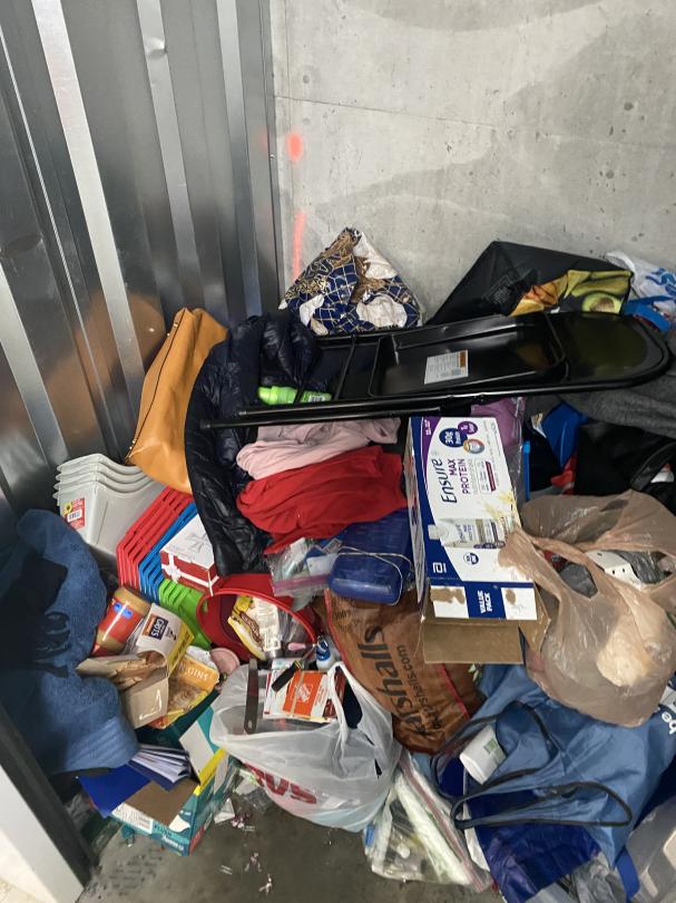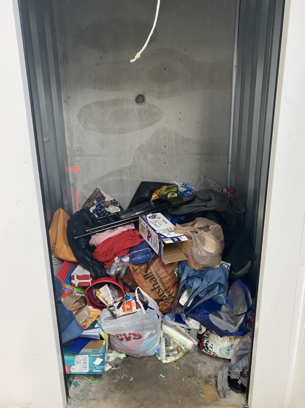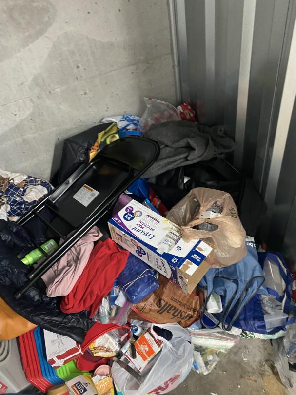 This unit appears to contain…Bags, clothes, chair, misc personal items
