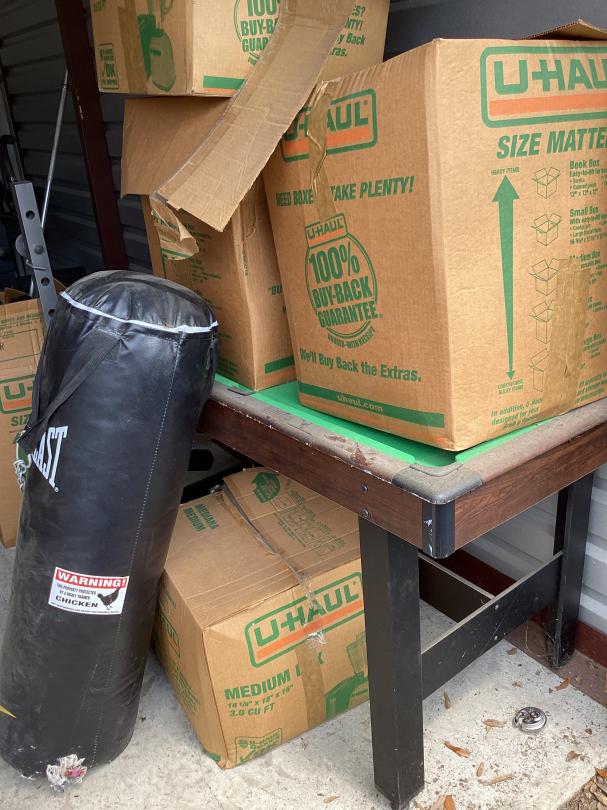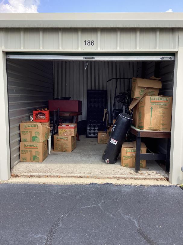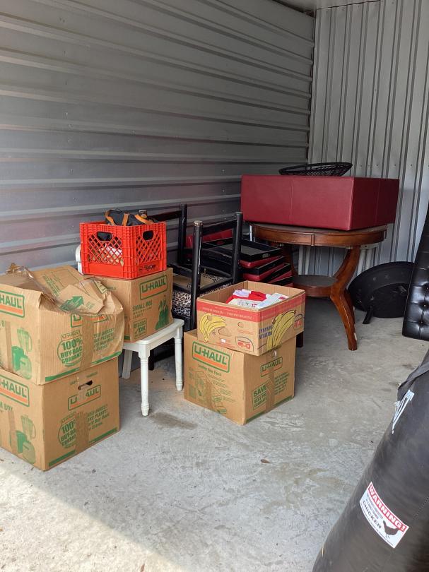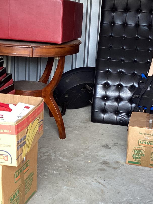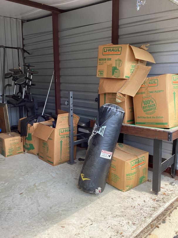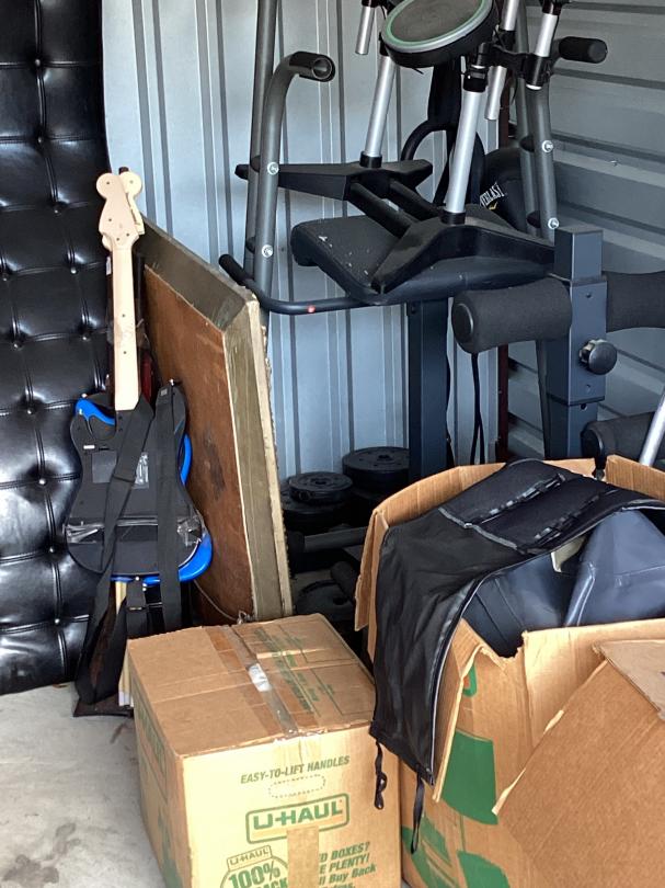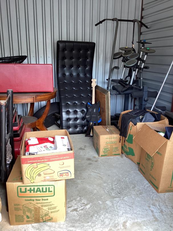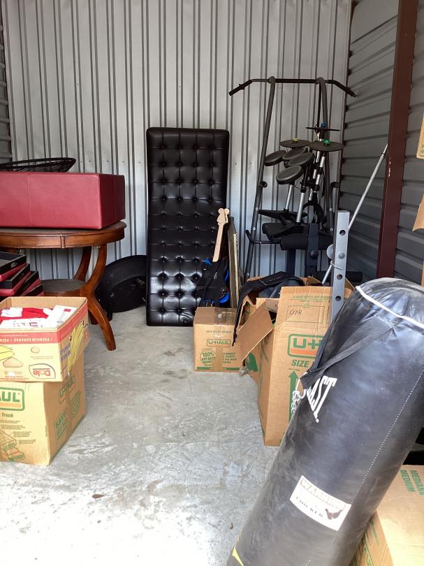 This unit appears to contain…Drive Up Unit appears to contain; Boxes, chairs, dining room table, workout equipment, ottoman, small pool table, punching bag, weights, fire pit, guitar hero