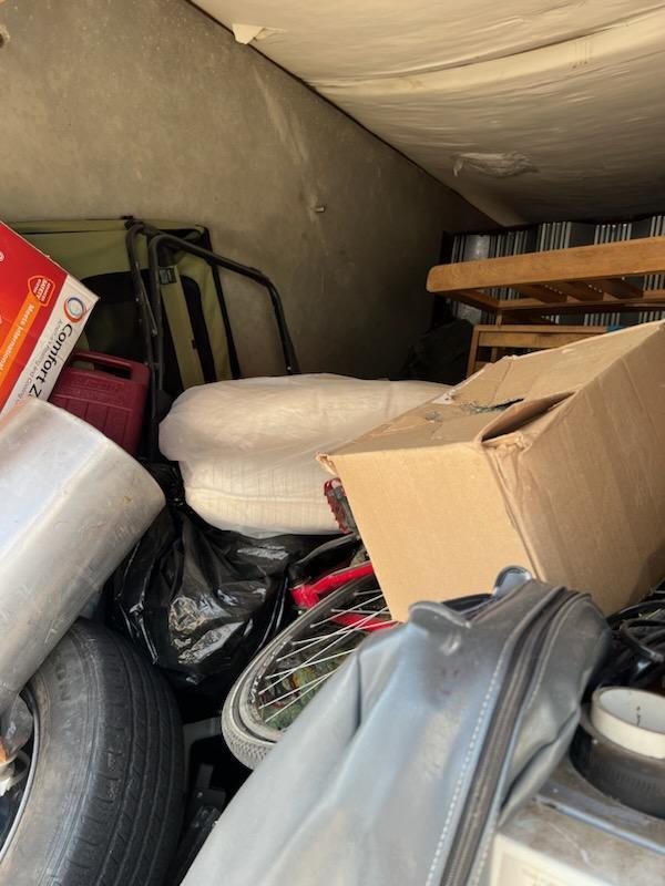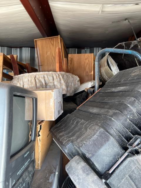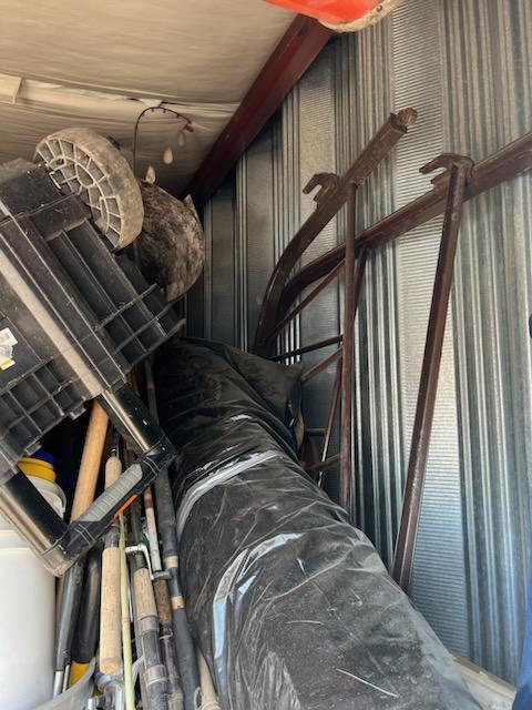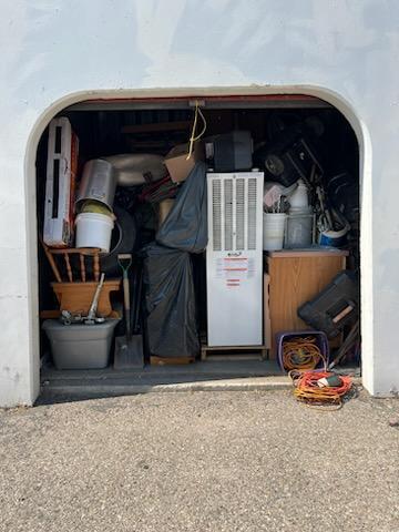 This unit appears to contain…This unit has a furnace, lots of wooden furniture, fan, tools, hand tools, bike, tires, bed frames, tv, shovel, buckets totes, patio furniture, rocking chair.