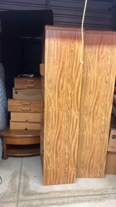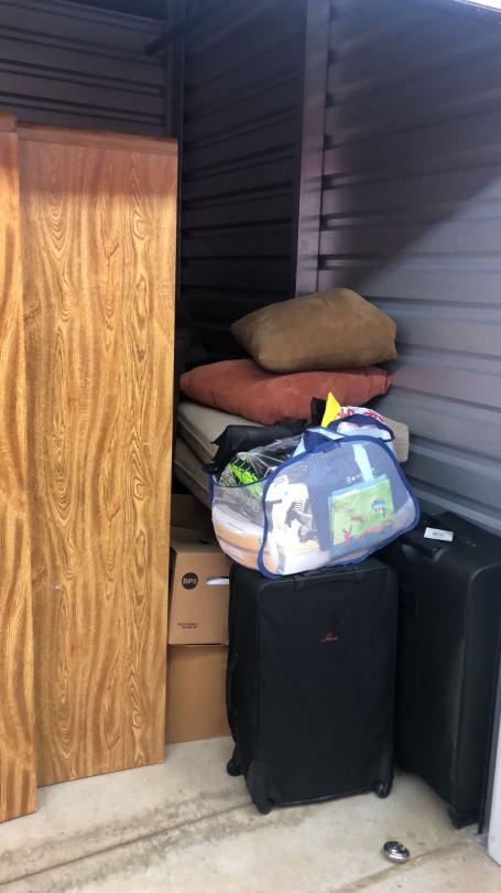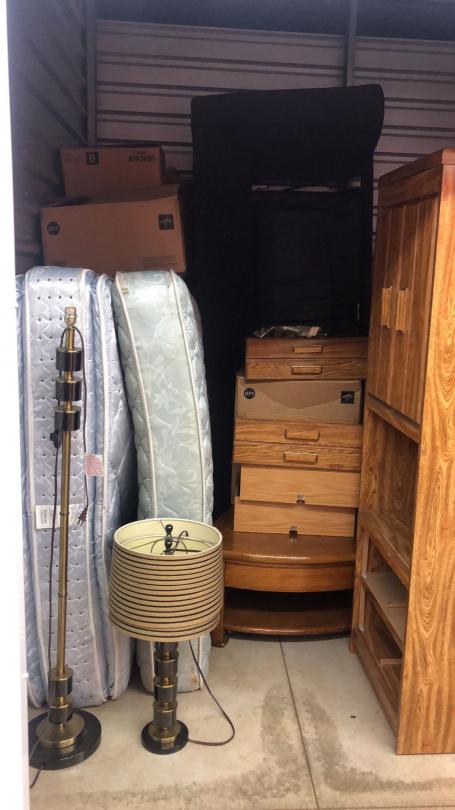 This unit appears to contain…Full size mattresses, 2 entertainment centers, miscellaneous boxes, floor lamp, table lamp, miscellaneous pillows, 2 upright soft side suitcases and couch.