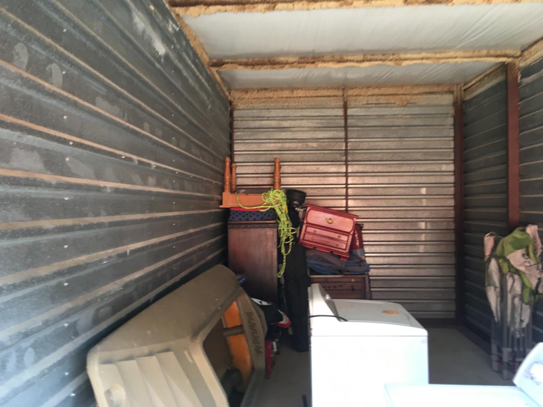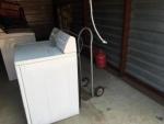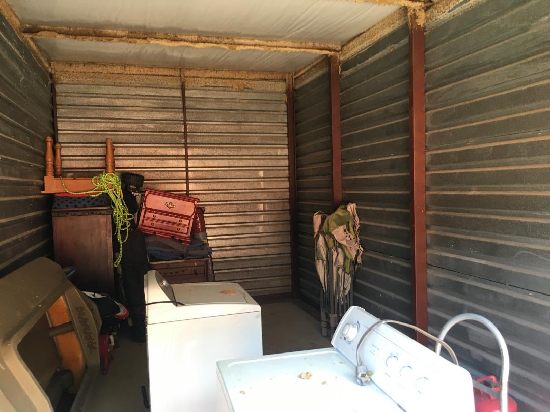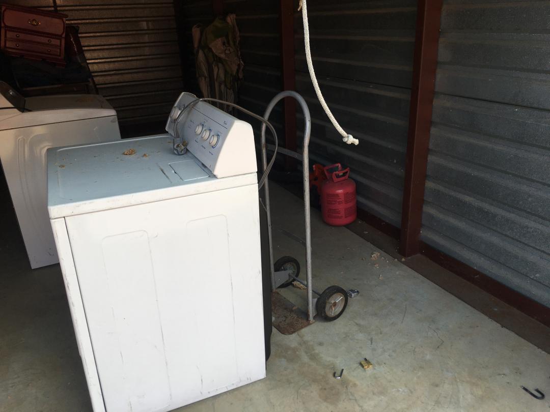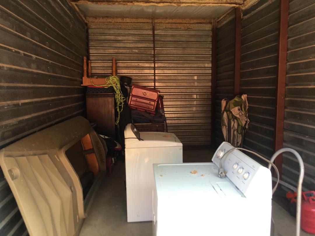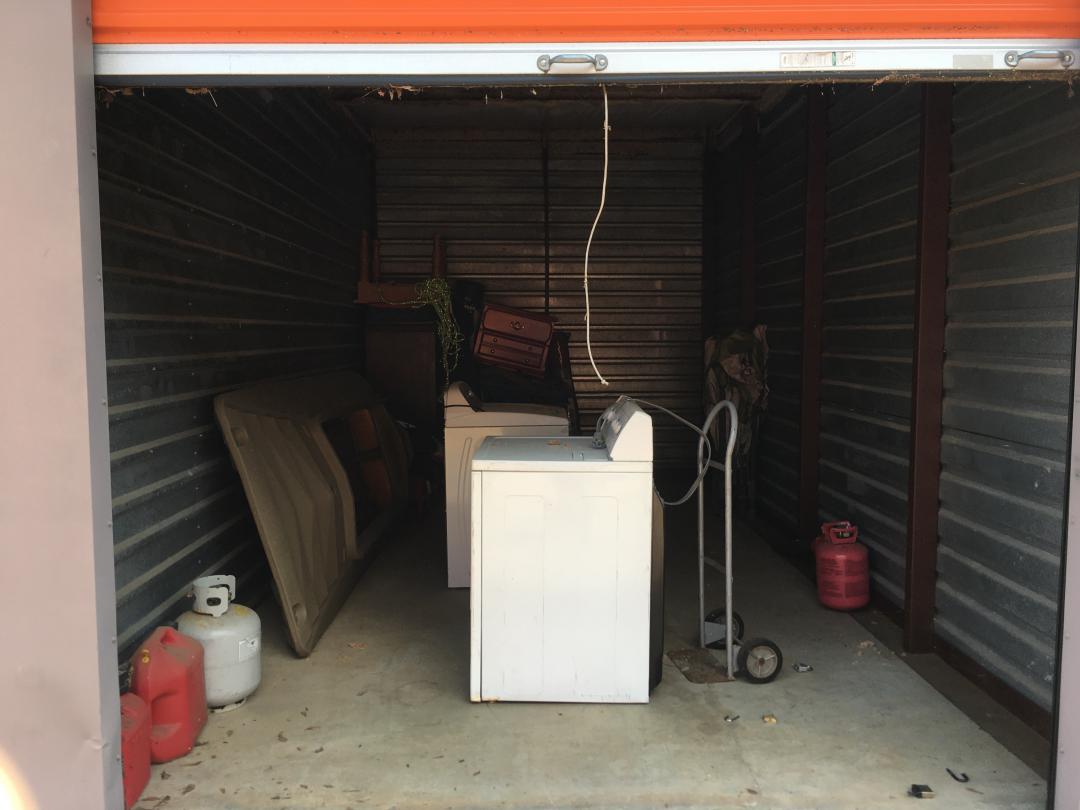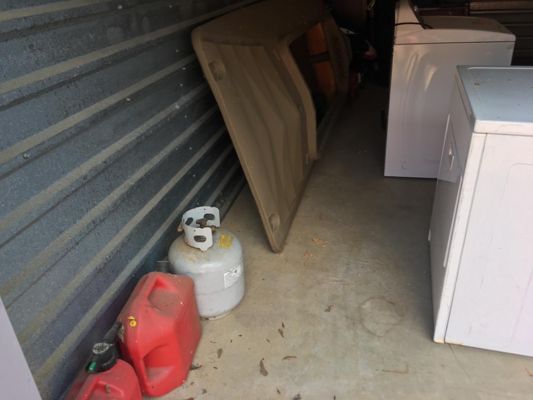 This unit appears to contain…Washer, Dryer, dolly 2 Wheel, 2 Gas Cans, 2 Propain Tanks, Beavertail Canoe, 2 Popup Tents, Tens, Night Stand, End Table, Pitching Machine, Life Jackets, Small Child's School Desk, Armoire, Gas Leaf Blower