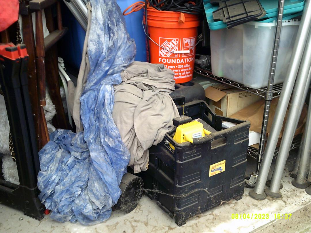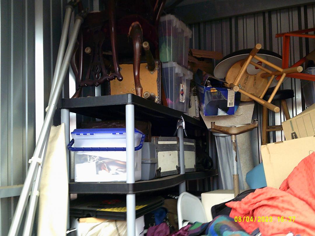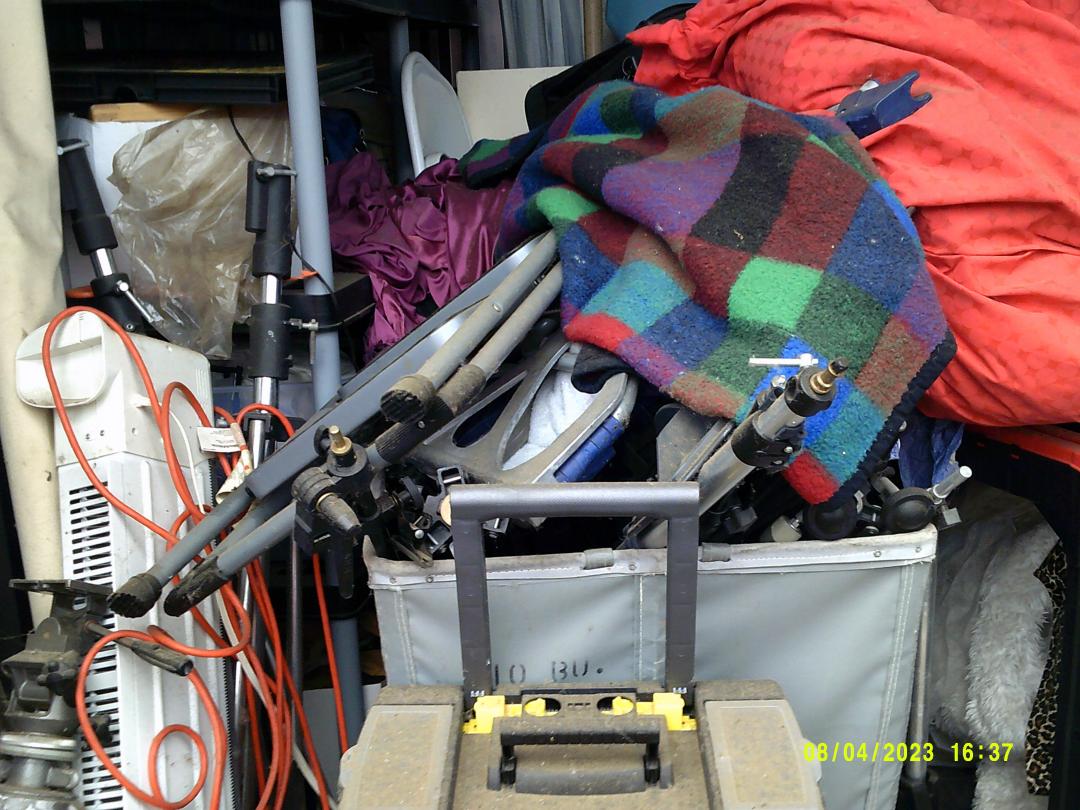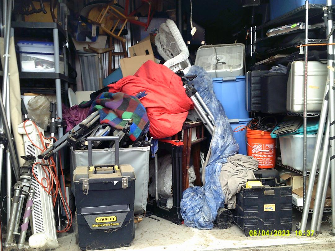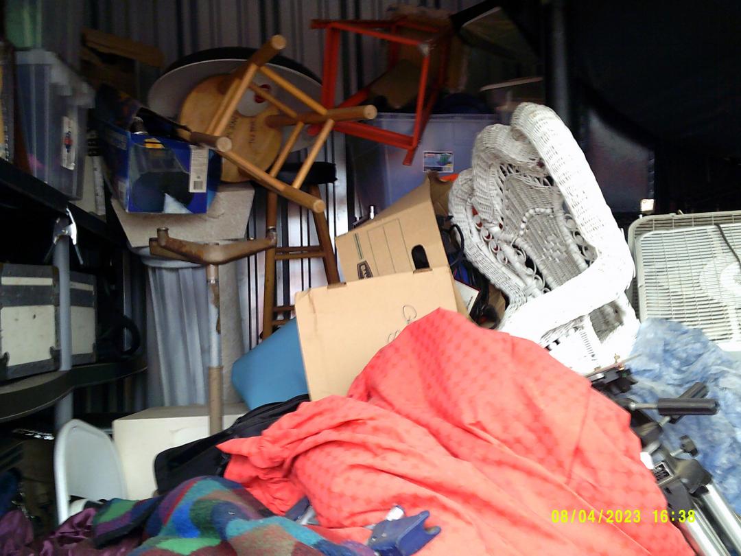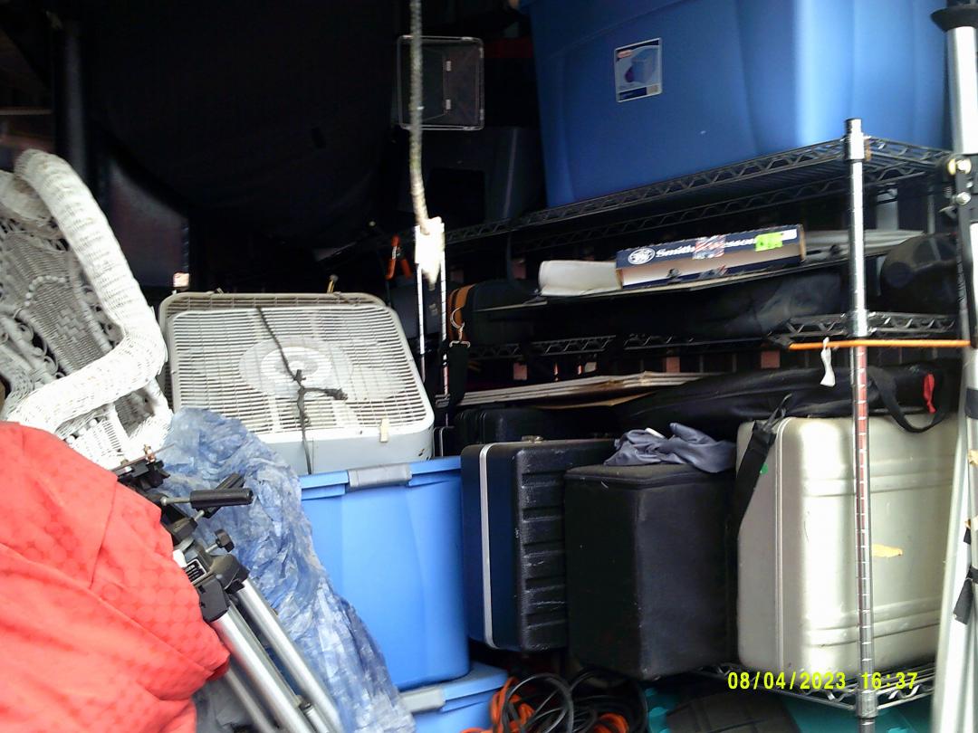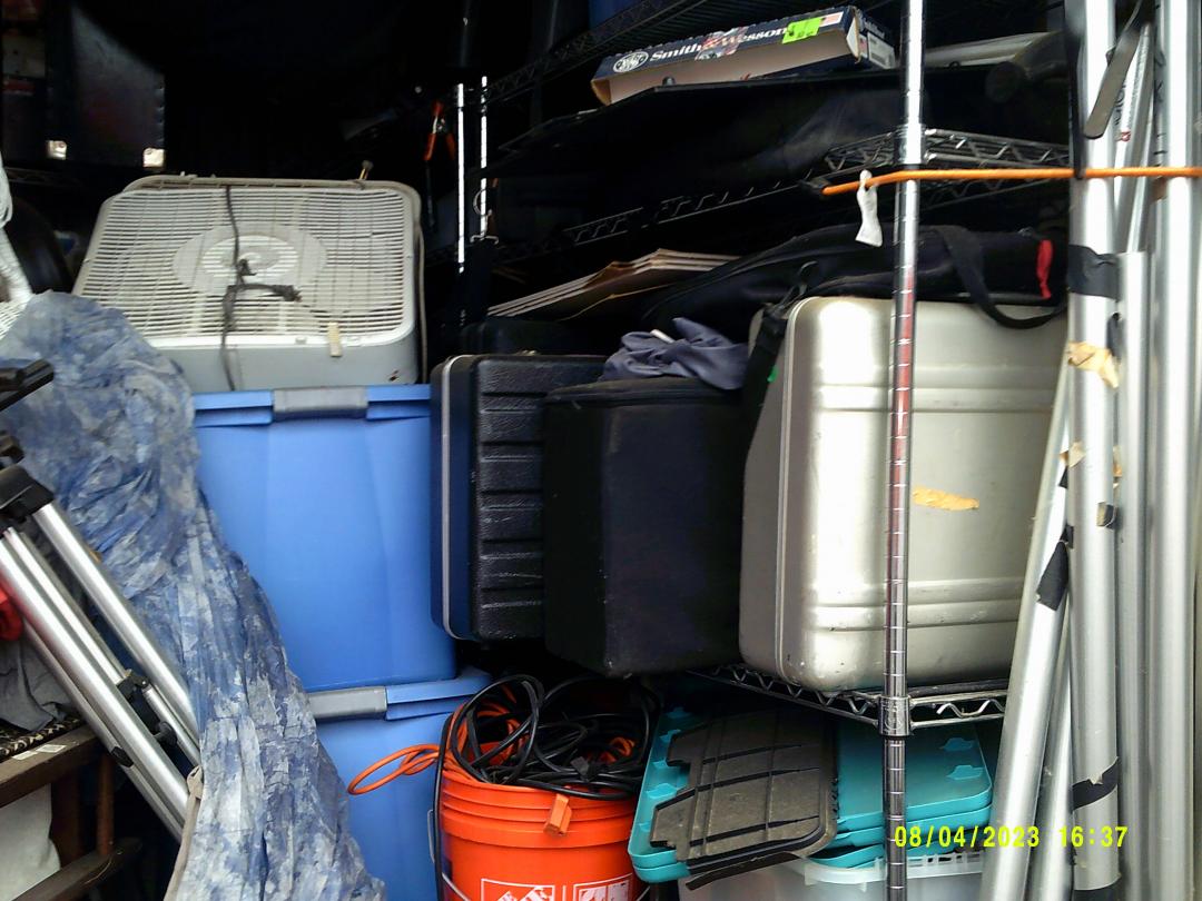 This unit appears to contain…READ ALL AUCTION RULES BEFORE BIDDING!!! Unit appears to contain: Tool boxes, tripods, shelving unit, totes, stools, chairs, fans, suitcase, lamps