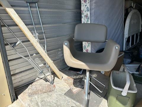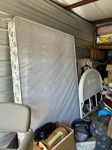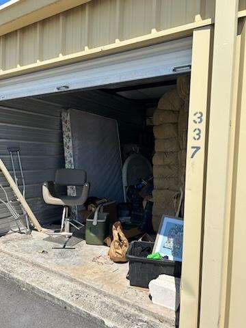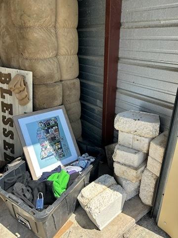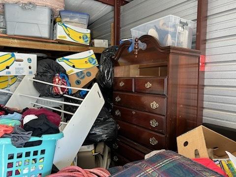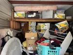 This unit appears to contain…This unit appears to contain two (2) salon chairs, a couch, landscape pavers, a nice wicker bedroom set, children books and dvds, steam cleaner, christmas tree, and a lot of kitchen cookware (some look to be new in unsealed boxes).