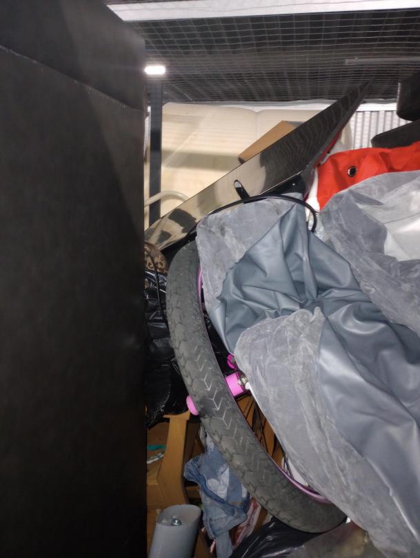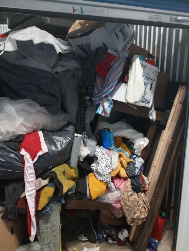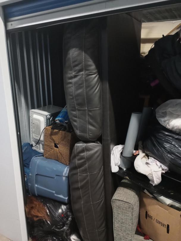 This unit appears to contain…bike, clothes, black plastic bags, couch, chair, totes, boxes