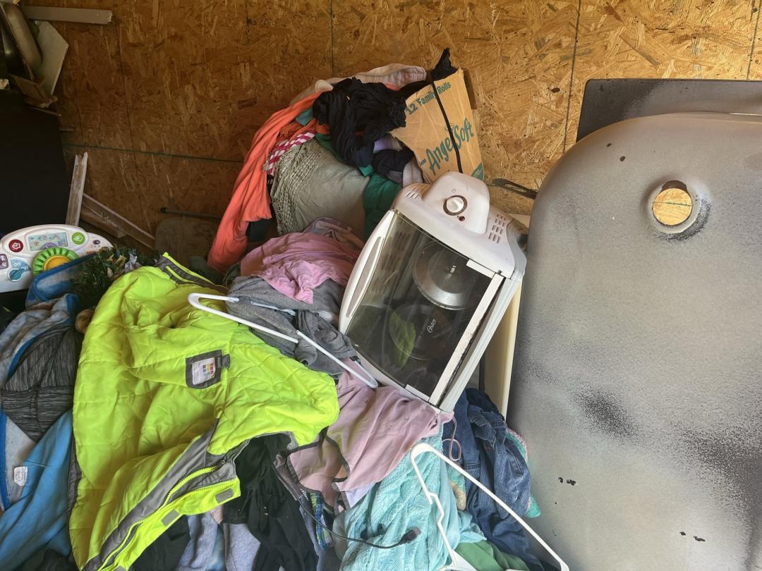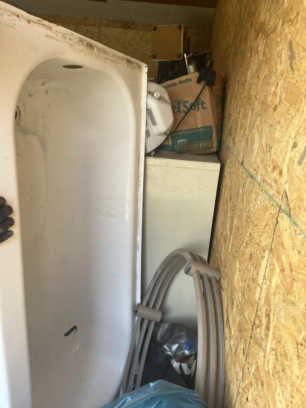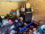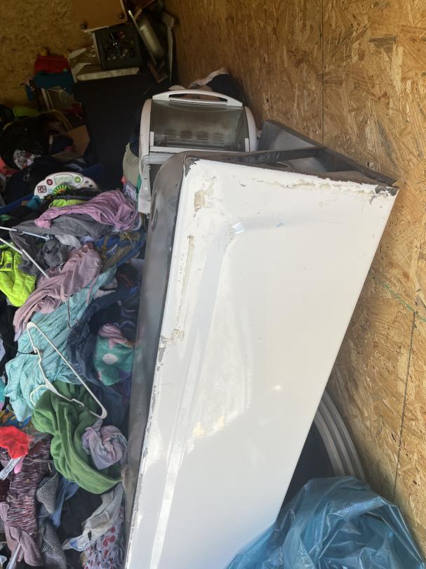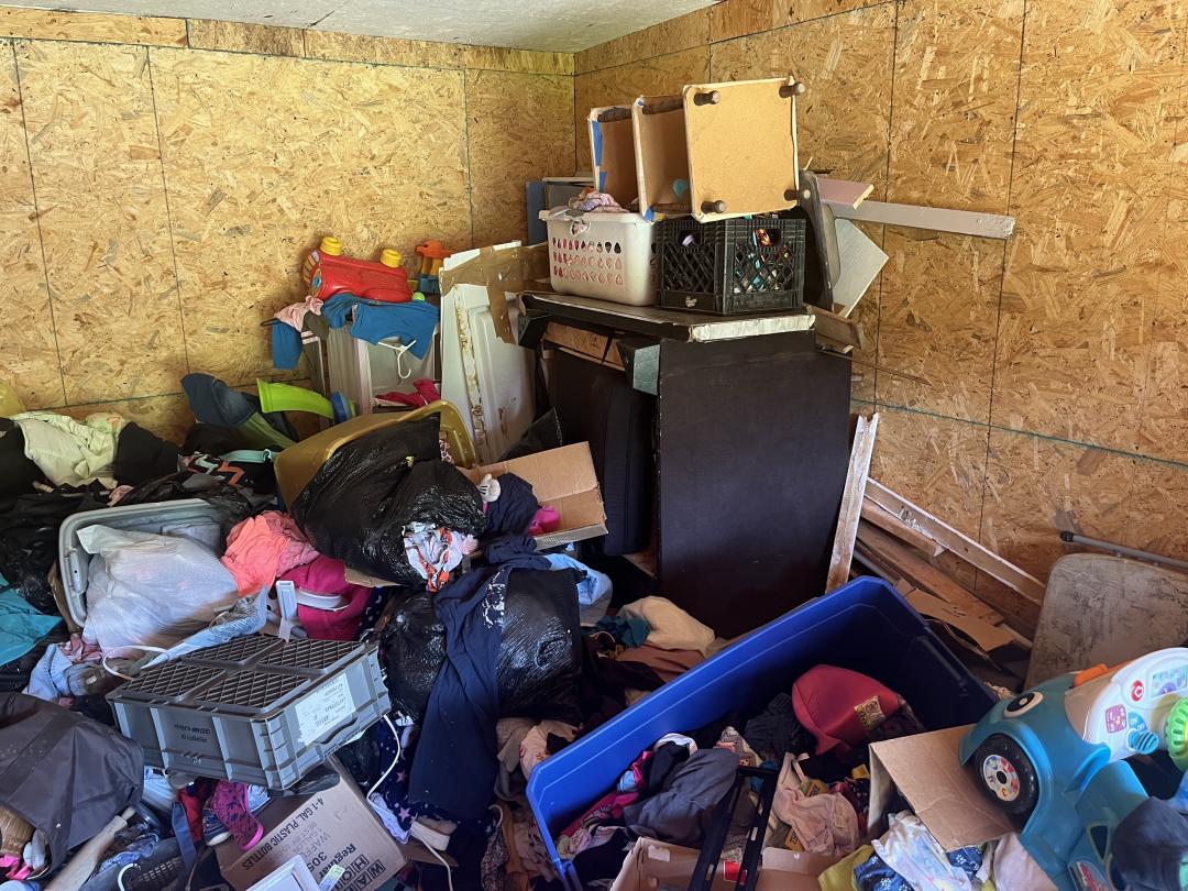 This unit appears to contain…Sink, Tub, Clothes, Dresser, Wood Slats & Pieces, Glassware, Toys, Furniture, DVD's, Loveseat, Small Appliance