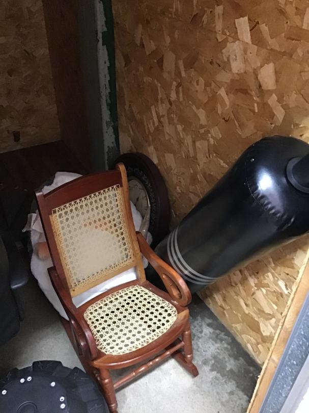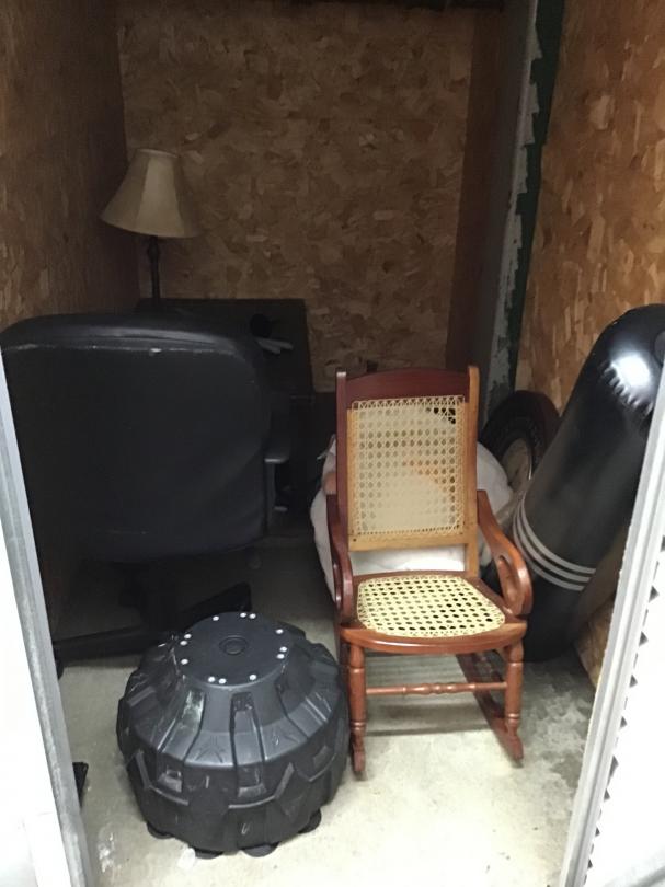 This unit appears to contain…5x9x6 Lockers Heated, unit appears to have a punching bag, childs sized rocking chair, computer chair, lamp and other miscellaneous items