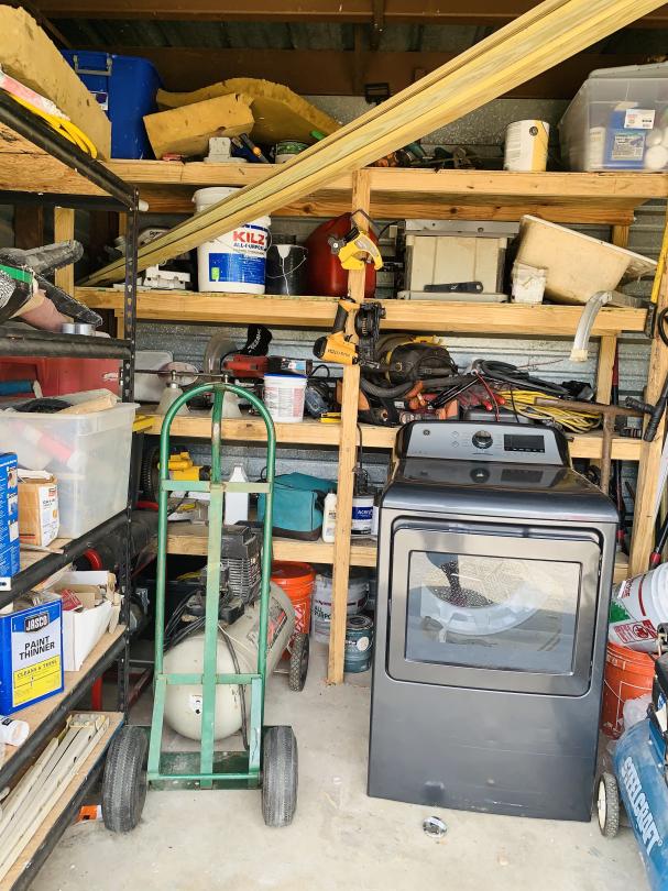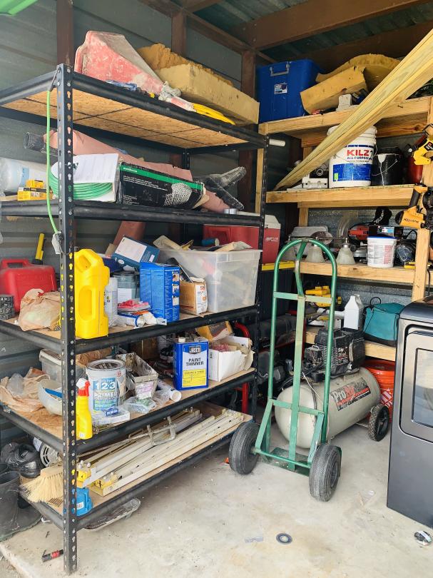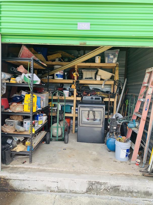 This unit appears to contain…washer, air compressor, ladders, tools, paint, light fixtures, generator, containers, ice chest