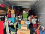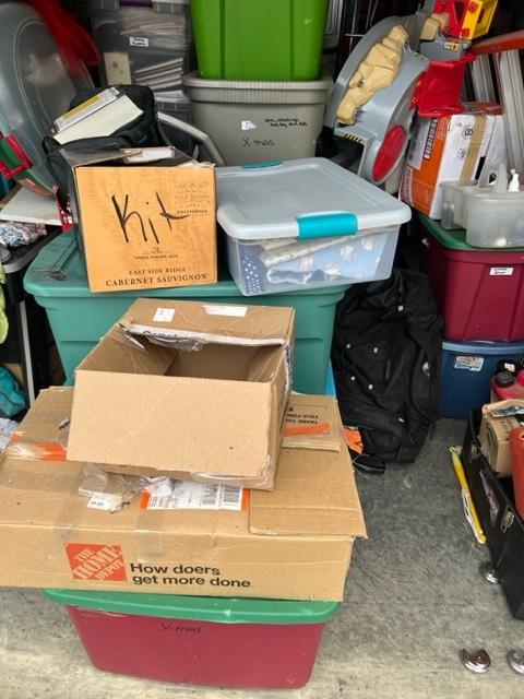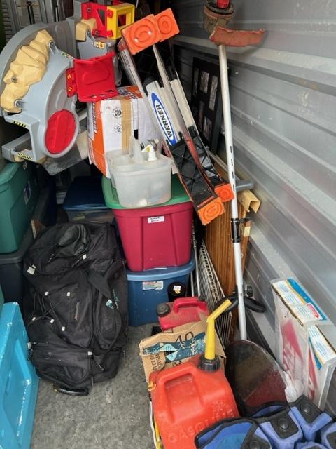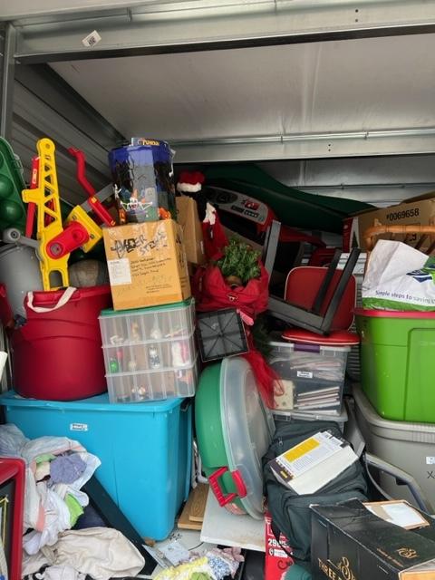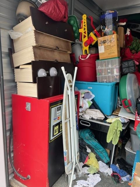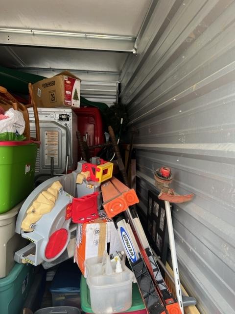 This unit appears to contain…Washer, Dryer, Ladder, Slide, Boxes, Bags, Totes, Couch, Bed Frame, Suitcases, Toys, Toy Box, Air Hockey Table.
