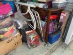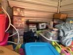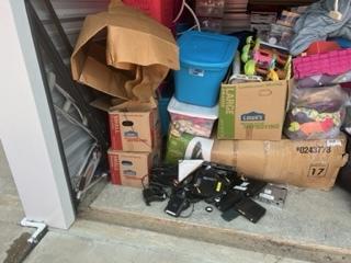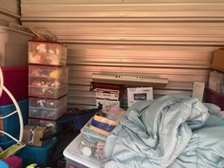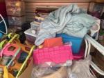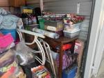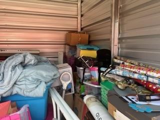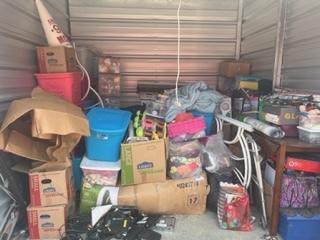 This unit appears to contain…Table, 2 Scooters, Bed frame, Crutches, Boxes, Totes, Suitcase, Keyboard, Childs Archery Bow, Toys