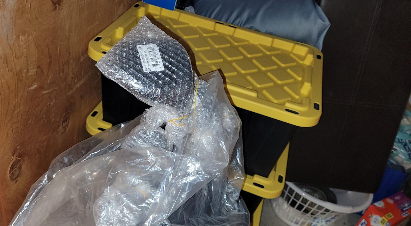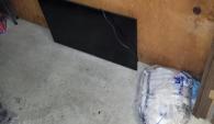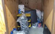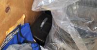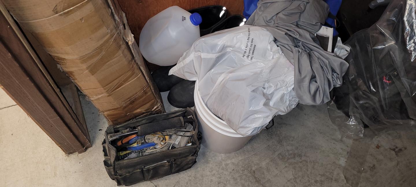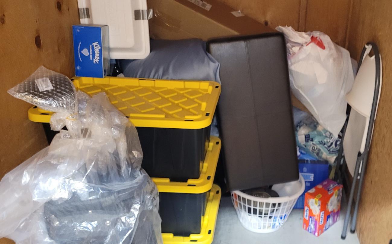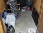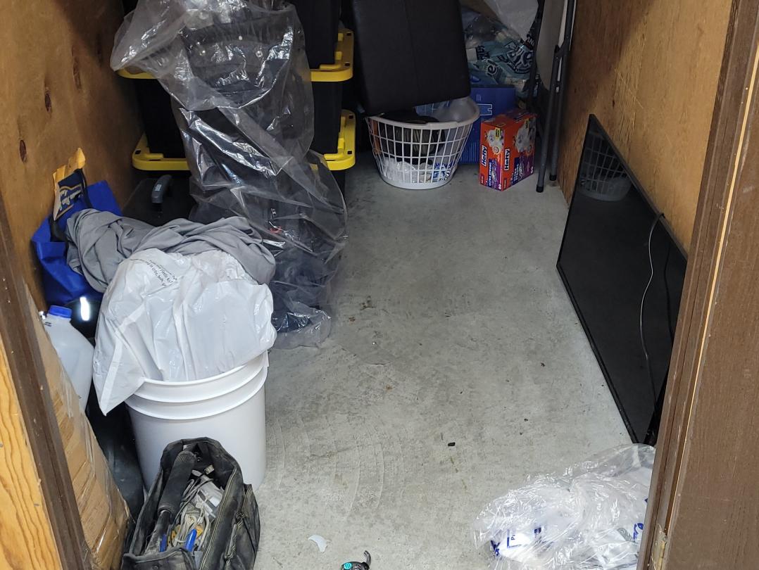 This unit appears to contain…tv, totes, folding chair, new golf clubs, tools, boots, small Weber grill