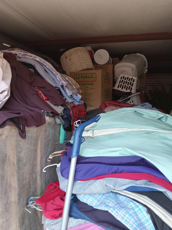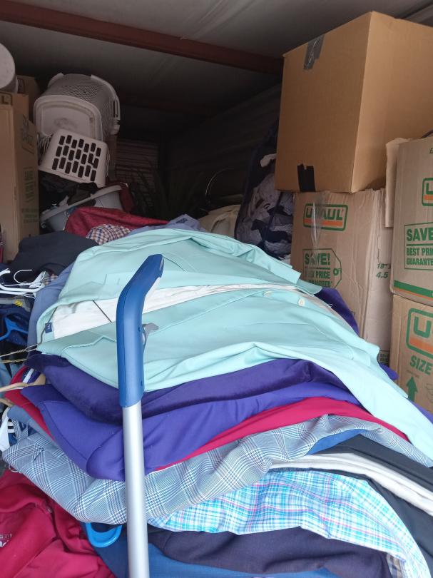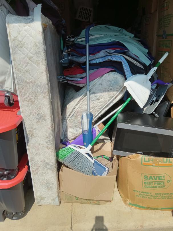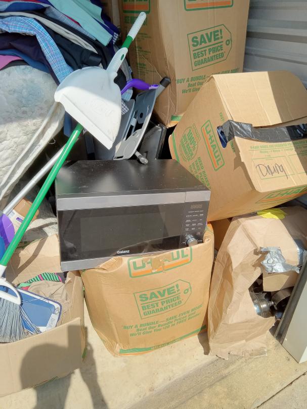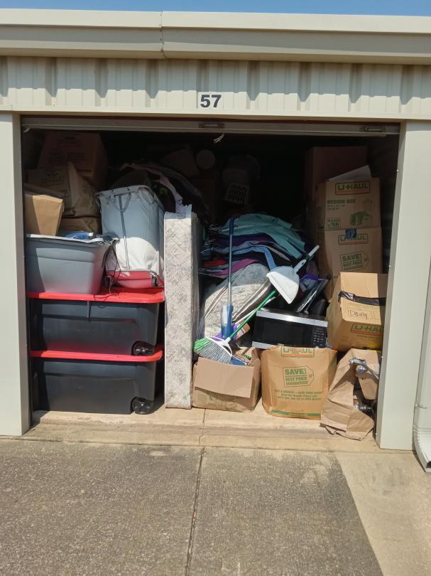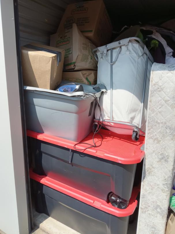 This unit appears to contain…mattress, box springs, microwave, boxes, totes, clothes, asst. decorations, TV, iron