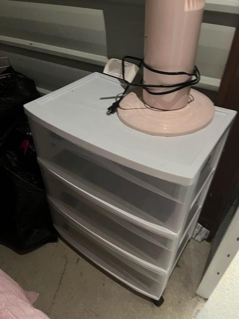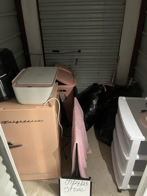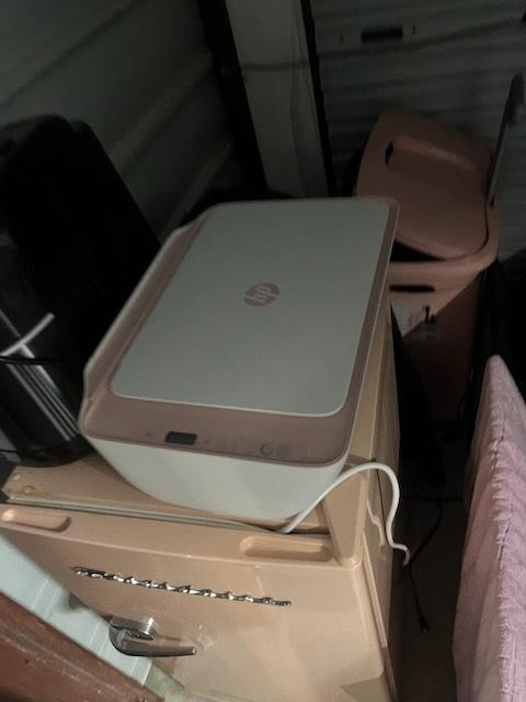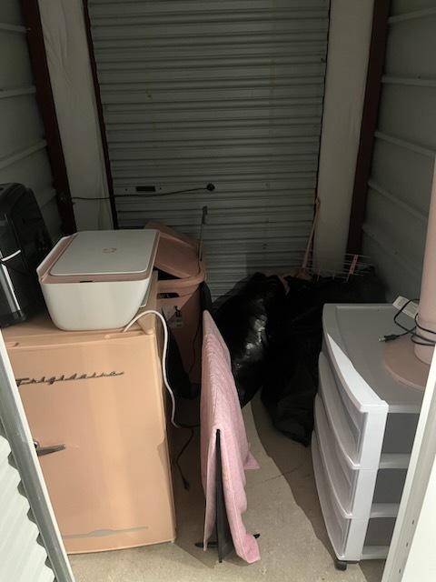 This unit appears to contain…Mini Fridge, Flat Screen TV, printer, Fan, Storage bins, Bags