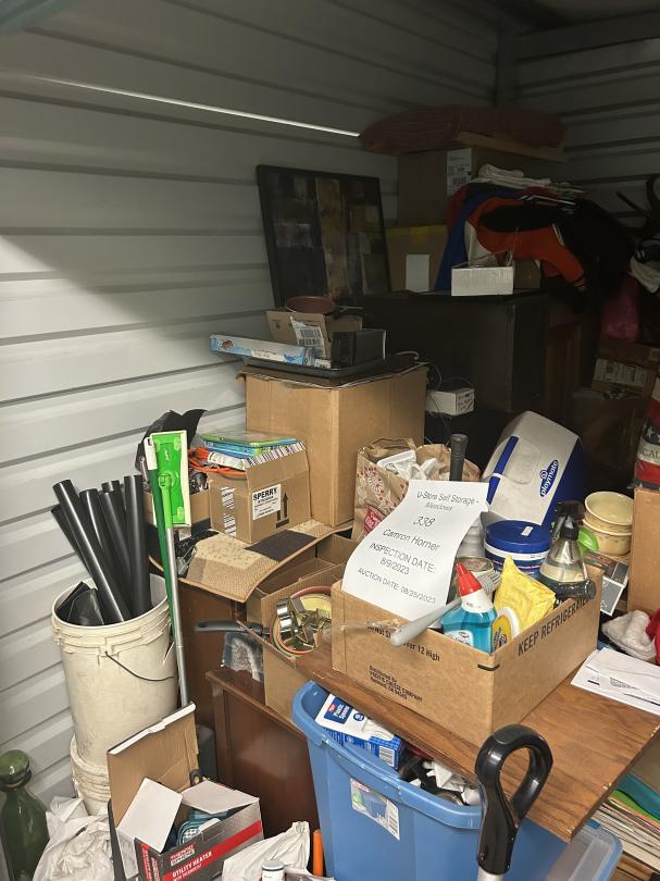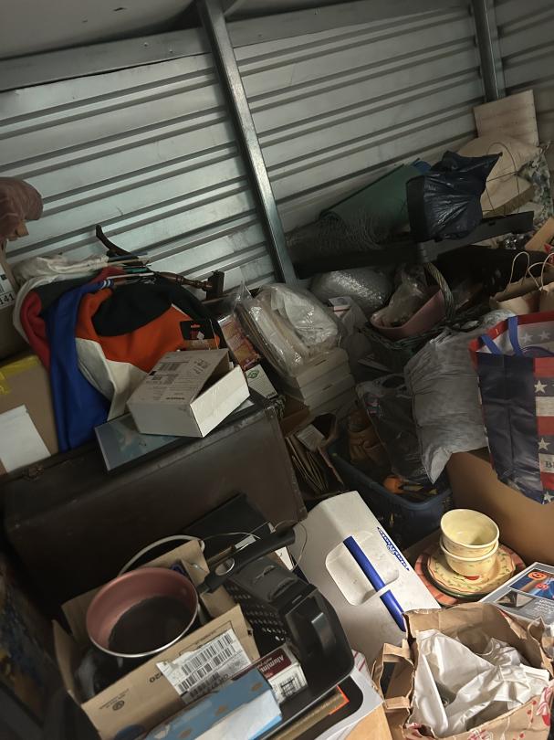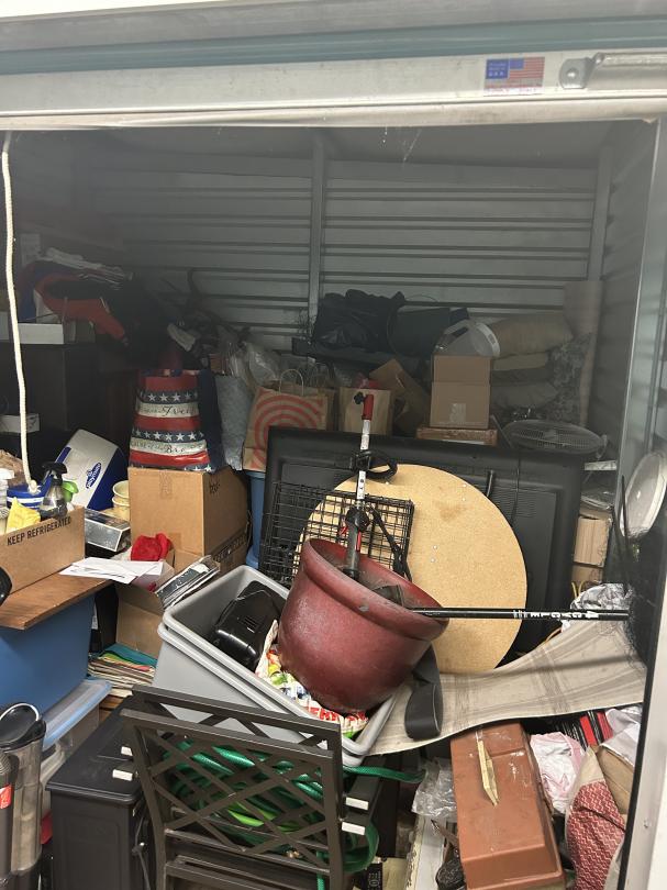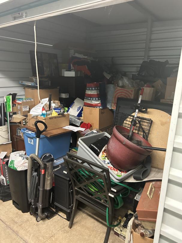 This unit appears to contain…Flat screen TV, 2 space heaters, yard tools, yard furniture, microwave, propane tank, misc furniture, window AC unit, boxes, old trunk, vacuum cleaner.