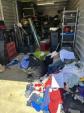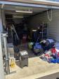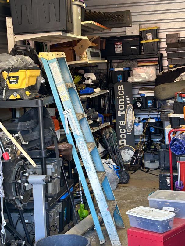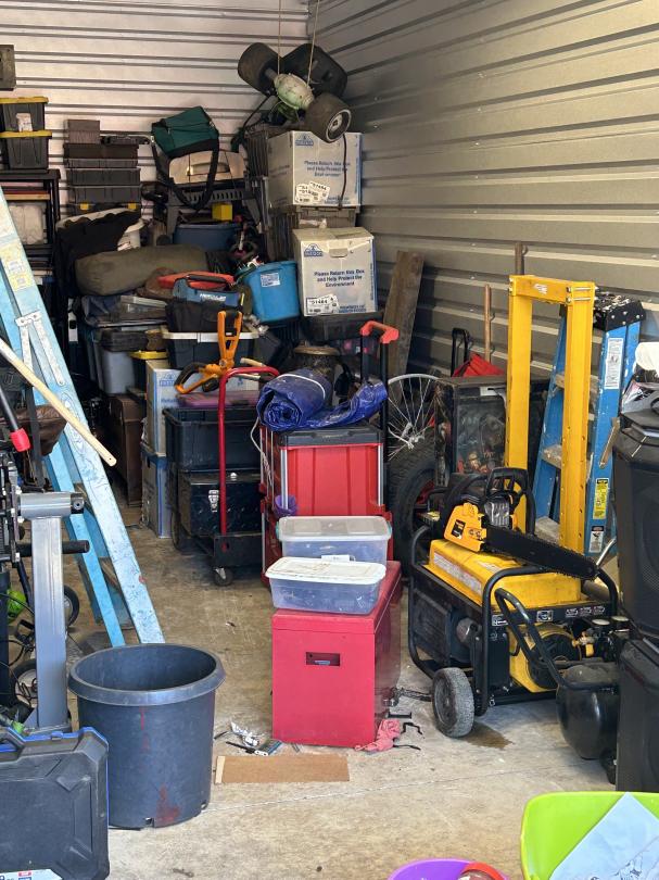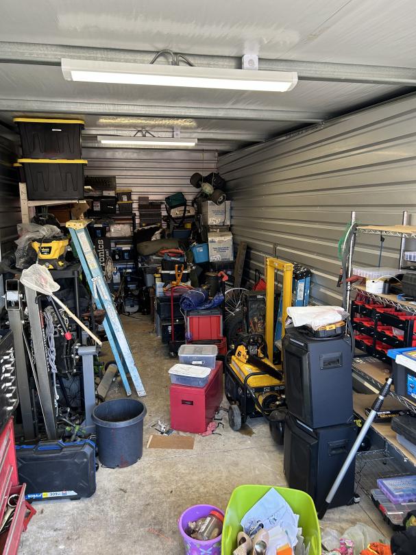 This unit appears to contain…Battery Charger, cherry picker, clothes, car engine, press, floor jacks, car ramps, chainsaw, generator, ladders, tool chests, shelves, boxes, speakers, air compressor, dolly, Milwaukee packout out kit, fishing poles, concrete bricks, nail gun, Ryobi power tool set, weed eater