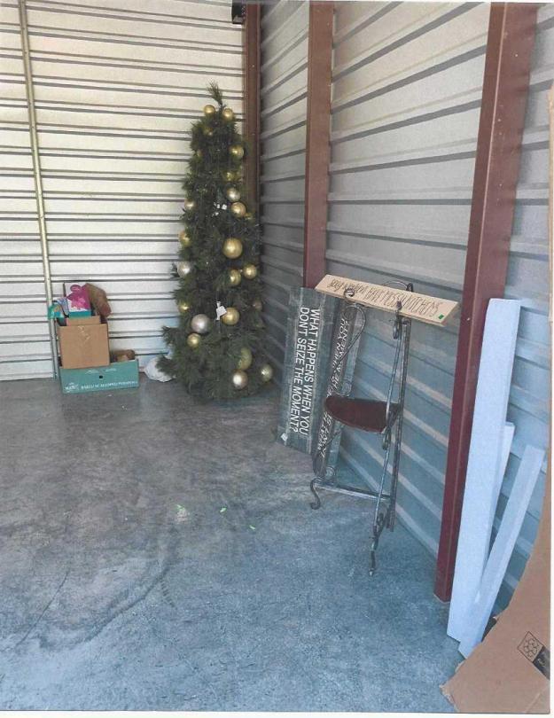 This unit appears to contain…Christmas Tree with ornaments, wooden chair, shelving unit, decorative sign, girls toys, 3 totes, 4+ boxes