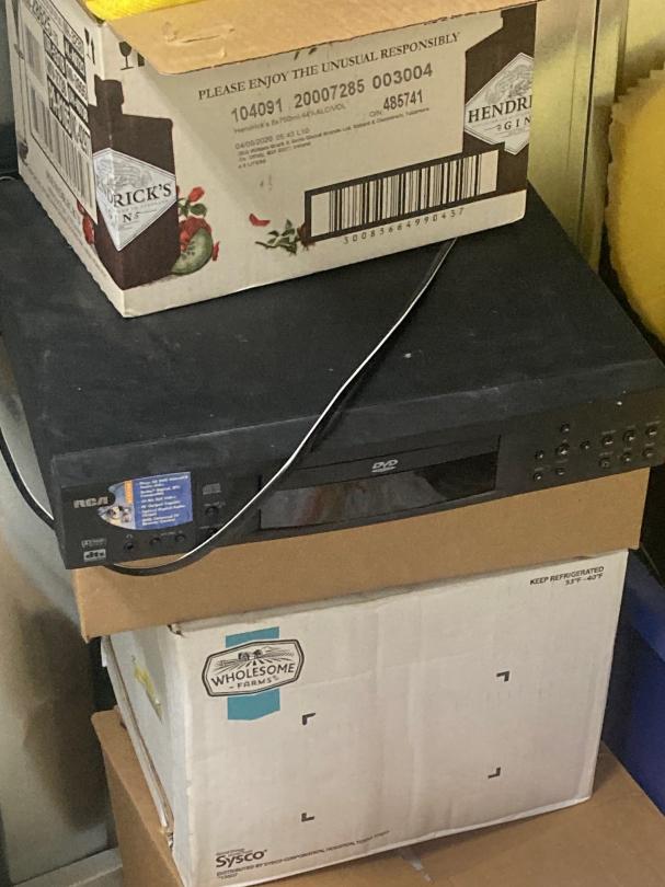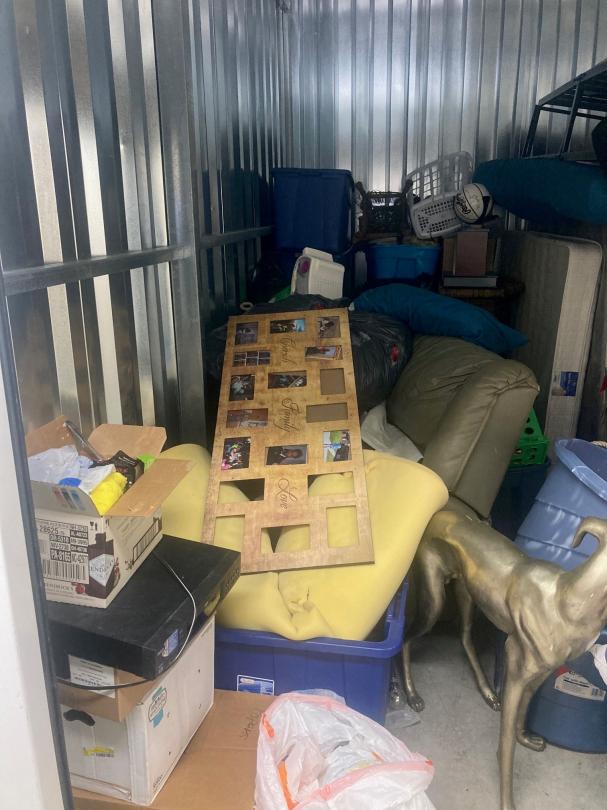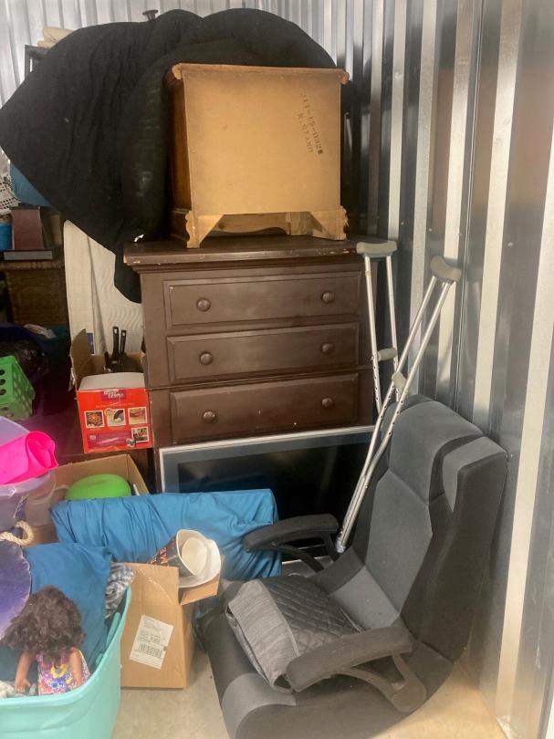 This unit appears to contain…Picture frame Gold dog DVD player Plastic totes Bed Dresser Crutches Dolls Gaming chair