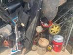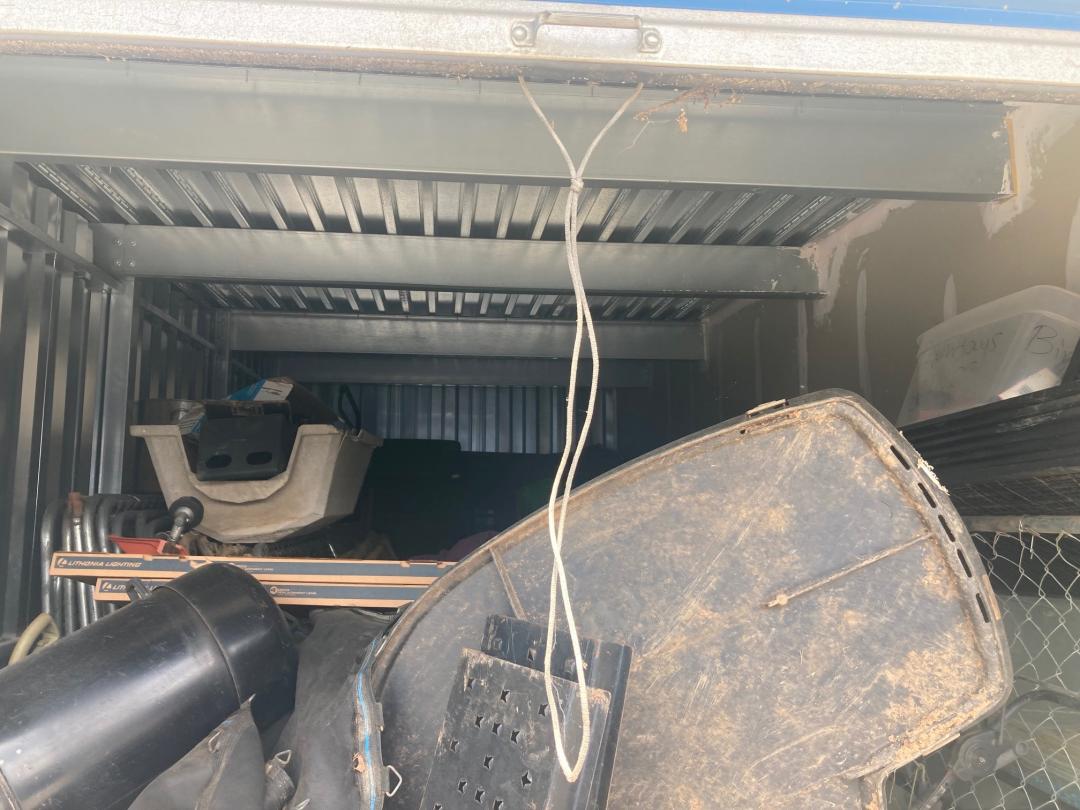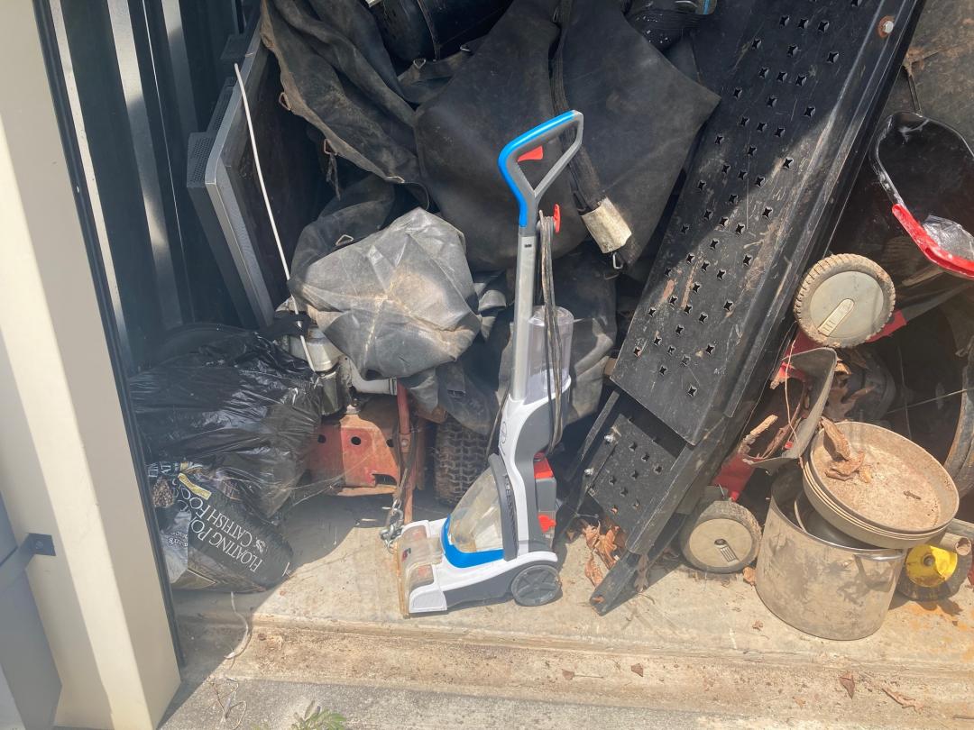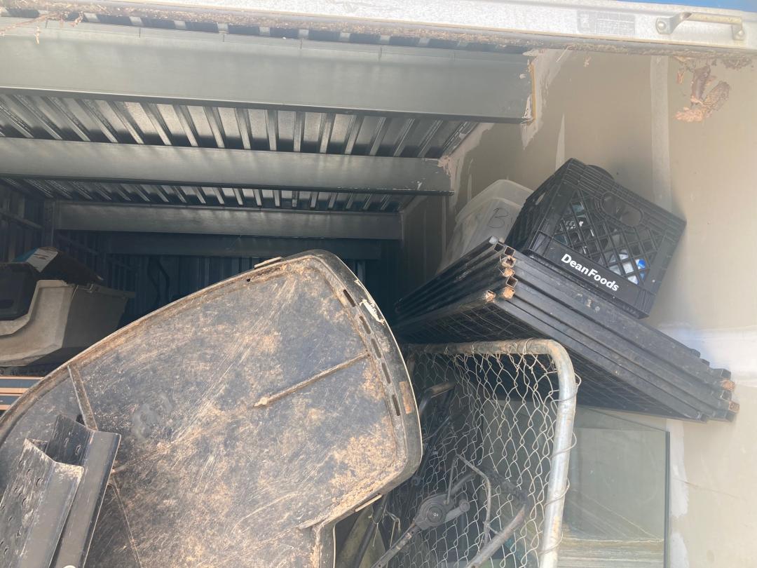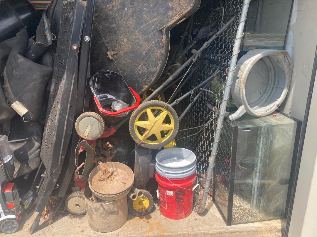 This unit appears to contain…Fence panels Milk crates Vacuum cleaner Ramps for automobile repairs TV Catfish food Terrarium (?)
