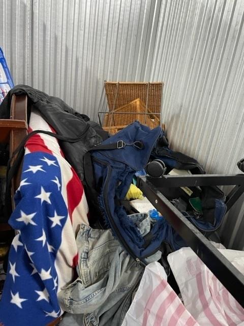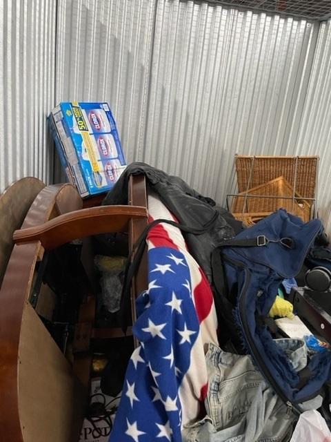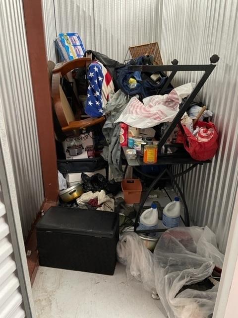This unit appears to contain…5X10X8CC: Bags, boxes, desk, clothes, coffee table, shelf, household goods