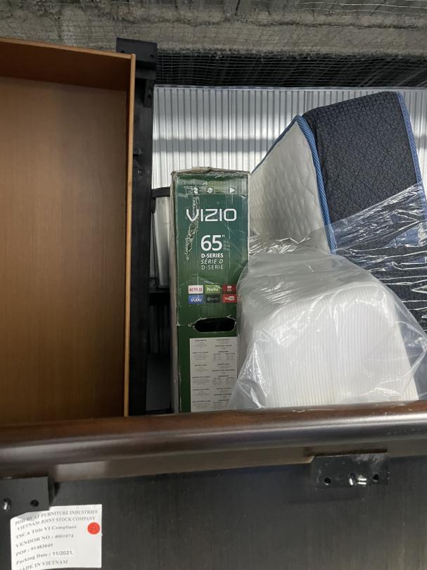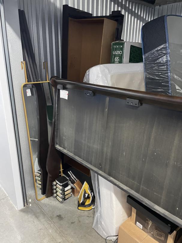 This unit appears to contain…Couch, Mattress, Bedset, desk, vacuum, totes, boxes