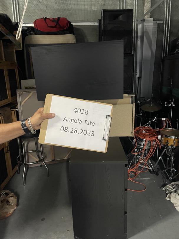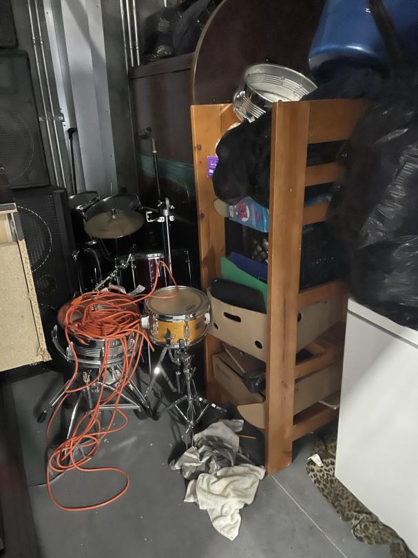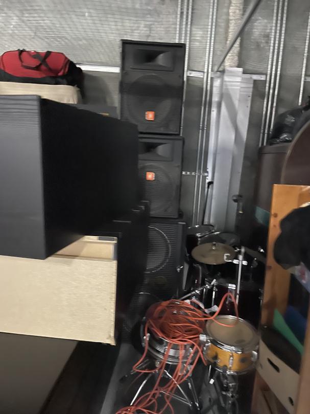This unit appears to contain…Drums, Sound equipment, speakers, shelves, cabinets, bags, boxes, totes, misc.