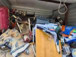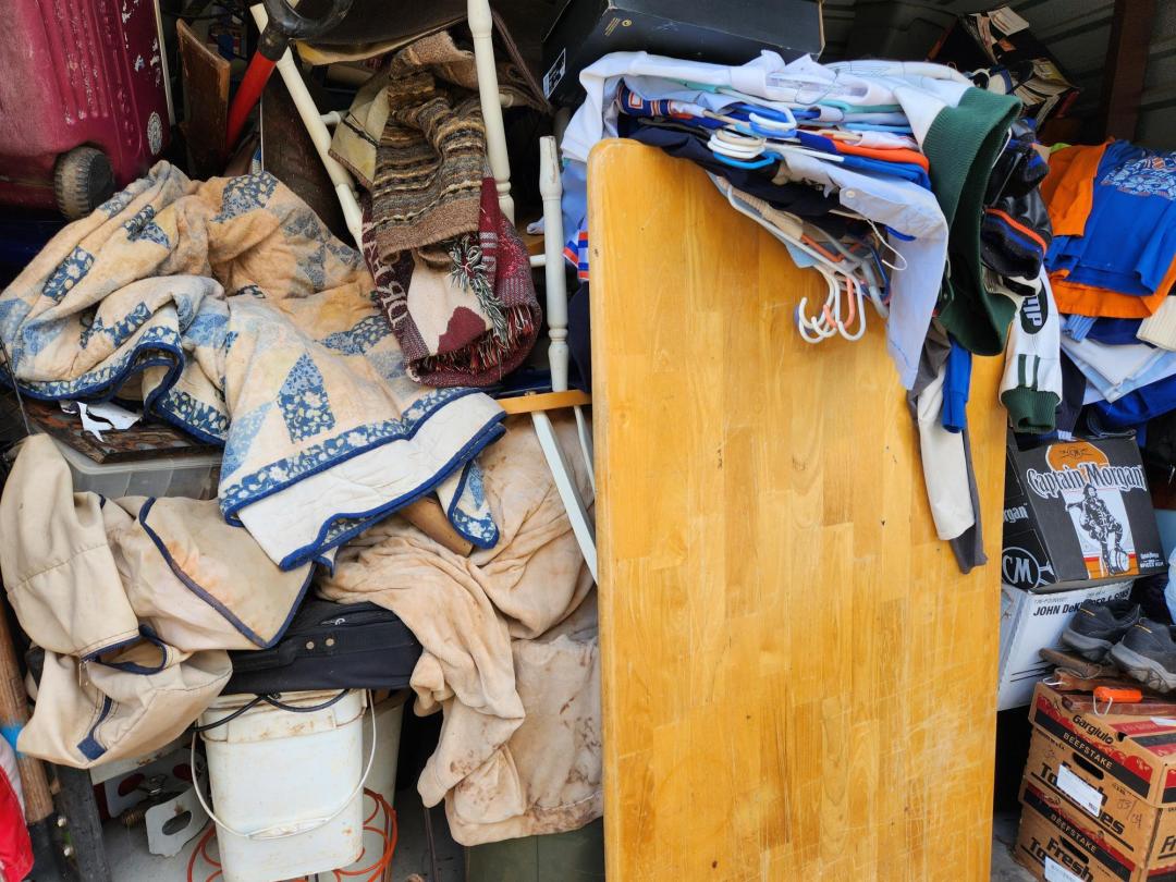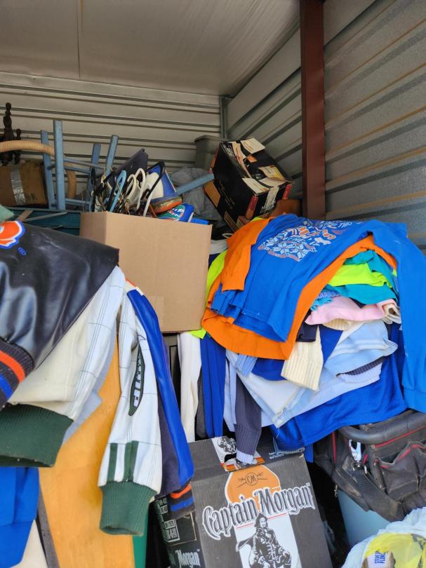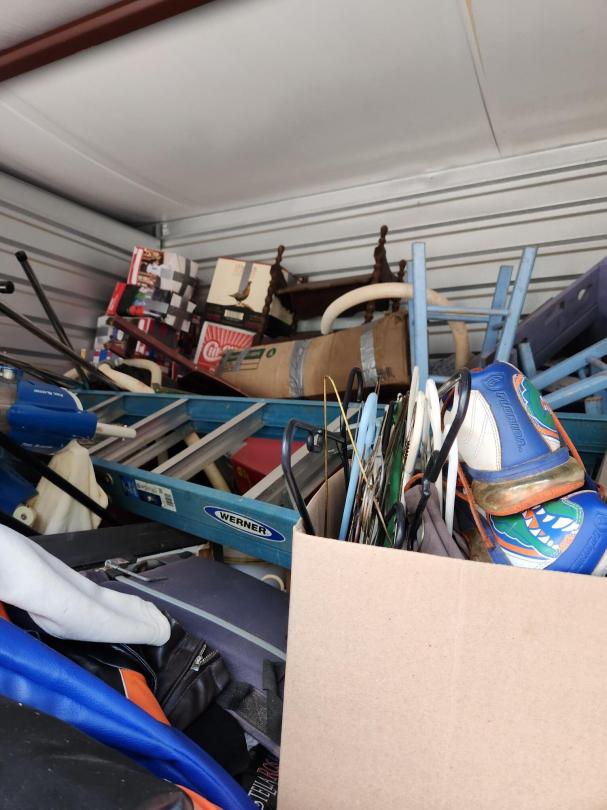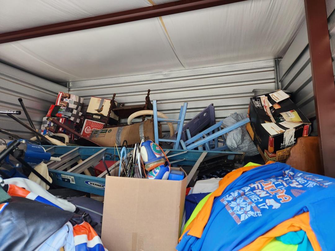 This unit appears to contain…Table, Pool Pump, Chairs, Cooler, Tools, Ladder, Clothes, Furniture, Totes, BB Gun, and Shoes