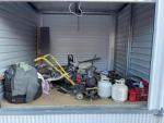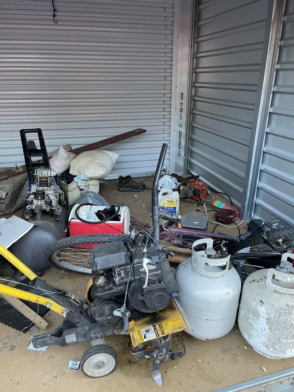 This unit appears to contain…Rototiller, Wires, Propane tanks, Cups, Milk crate, Log, Gas can, Bike, Chain saw, Cooler, Pillows, Compressor, Boards, Tarp, Blanket, Clothes, Tires, Towel, Pressure washer, etc....