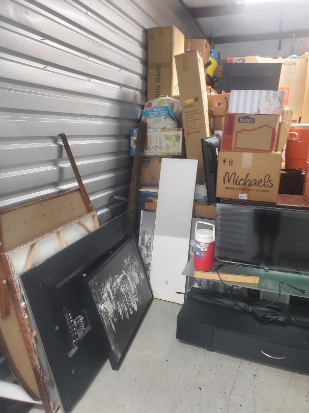 This unit appears to contain…Boxes, Totes, TV , Dresser