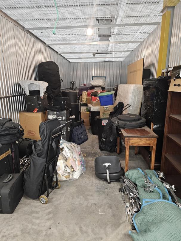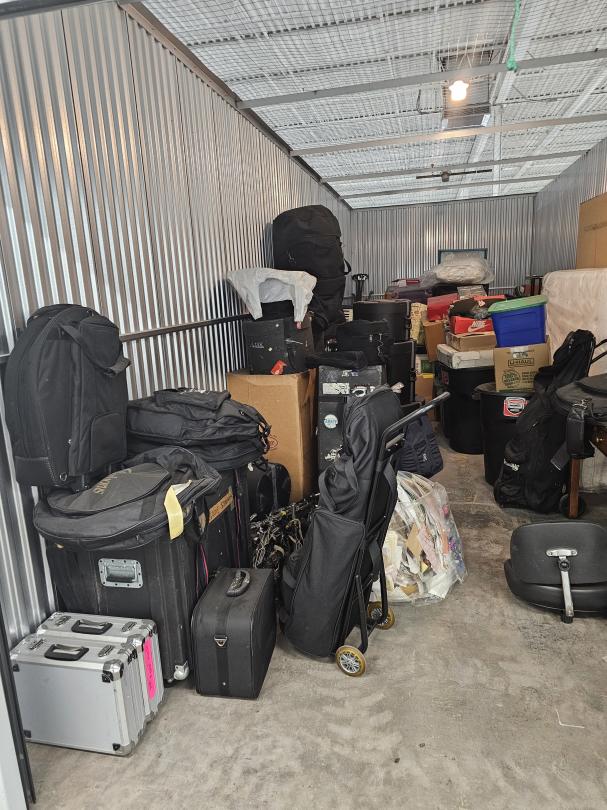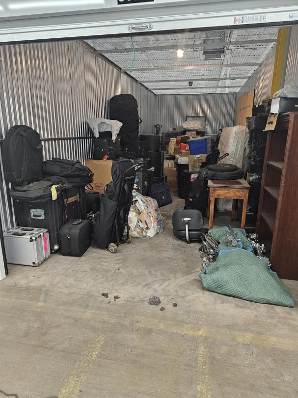 This unit appears to contain…Musical instruments, tables, shelves, bags, mattress, boxes, bed frame, other items