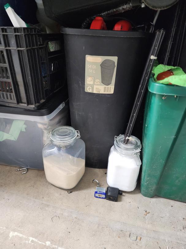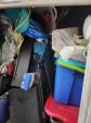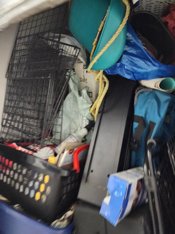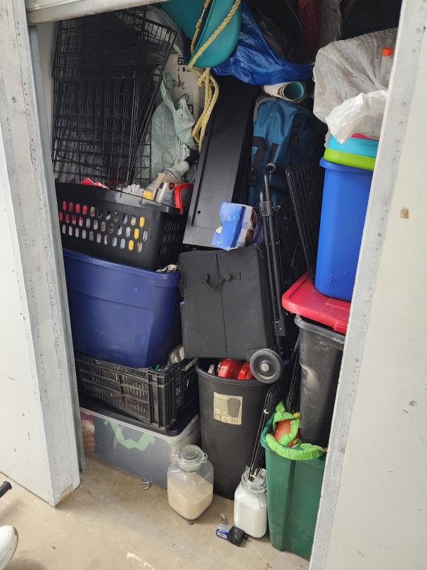 This unit appears to contain…interior trash can, animal crates, cleaning supplies, kitchen chair, toddler swing, milk crates, wicker basket, plastic totes, wire rolling cart
