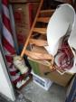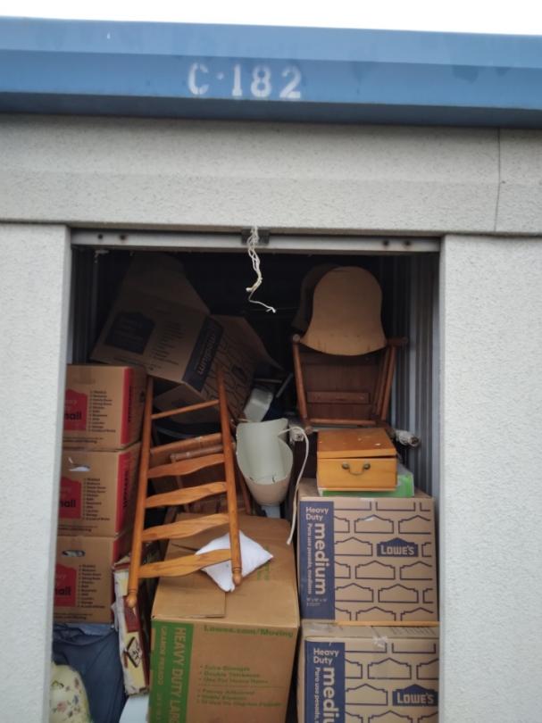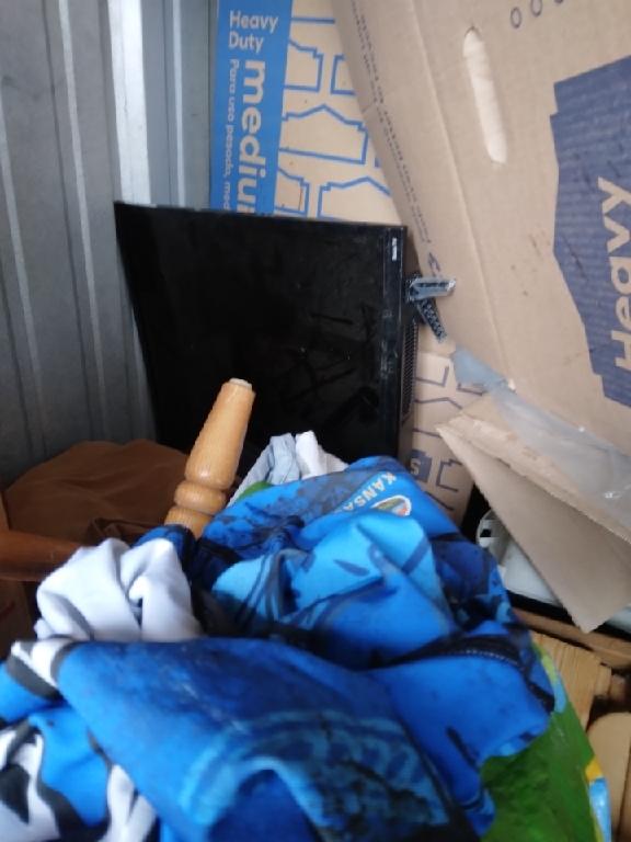 This unit appears to contain…BOXES, WOODEN CHAIR, WOODEN BOX, BLANKETS, TV WOODEN CABINET, LAMP, FLAG, ELECTRICAL CORD, SMALL AC? AND TOTES
