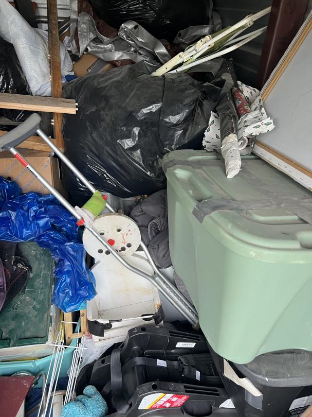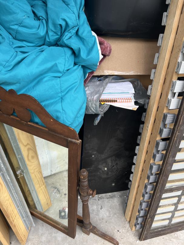 This unit appears to contain…storage box, mirror, clothing, crutch, furniture