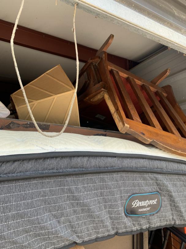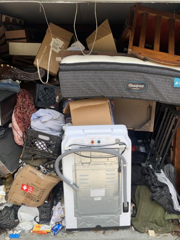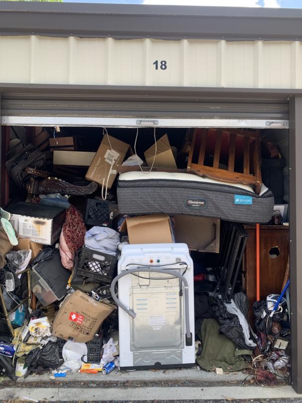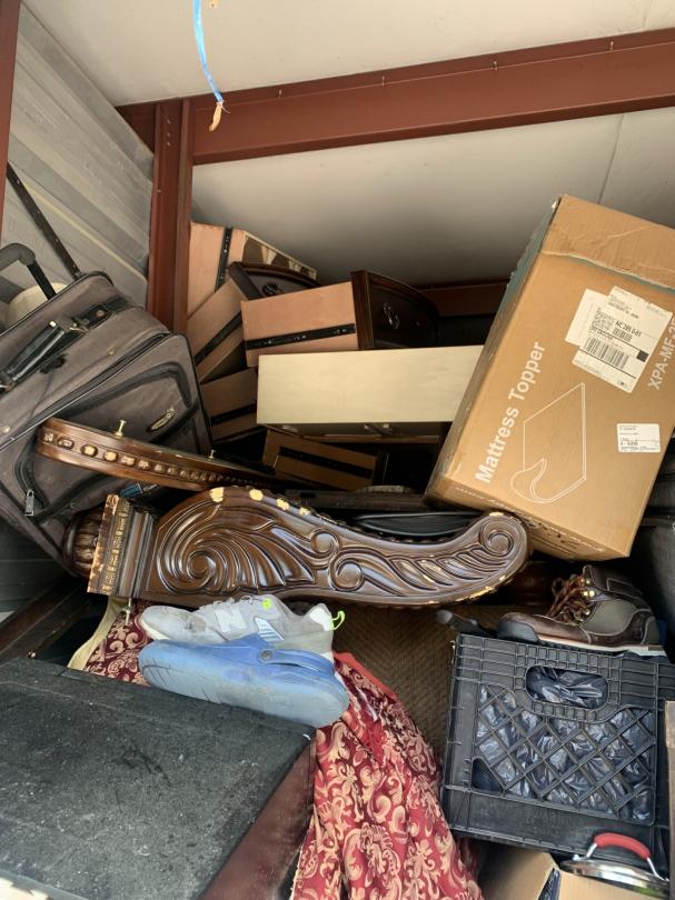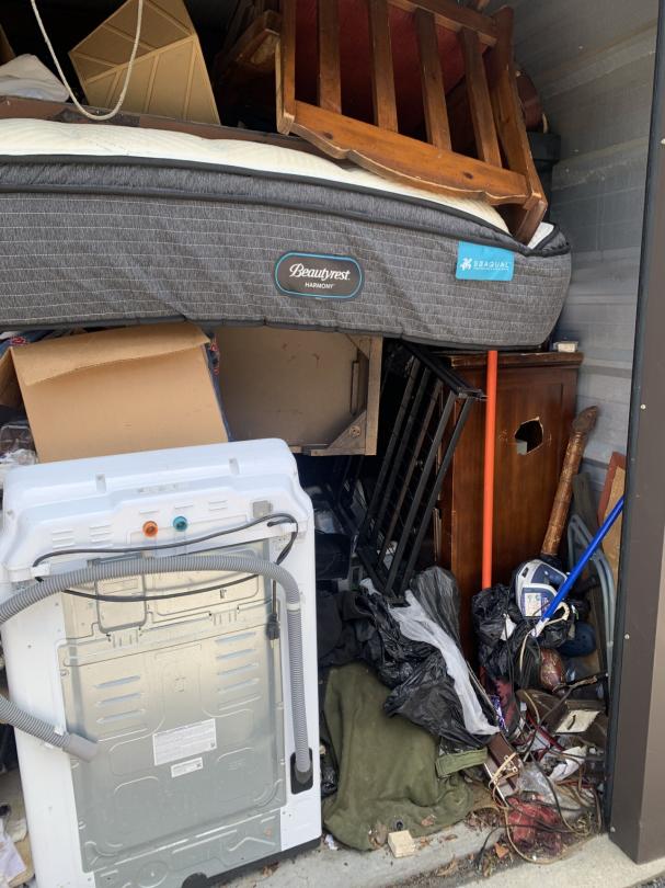 This unit appears to contain…washer, mattresses, chairs, tools, luggage, dresser, bed frame, assorted shoes and clothing