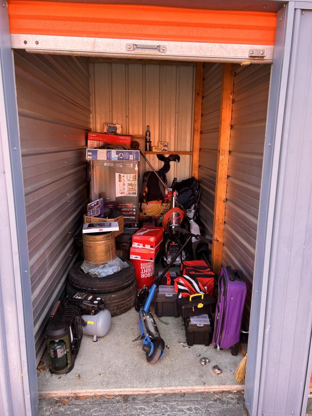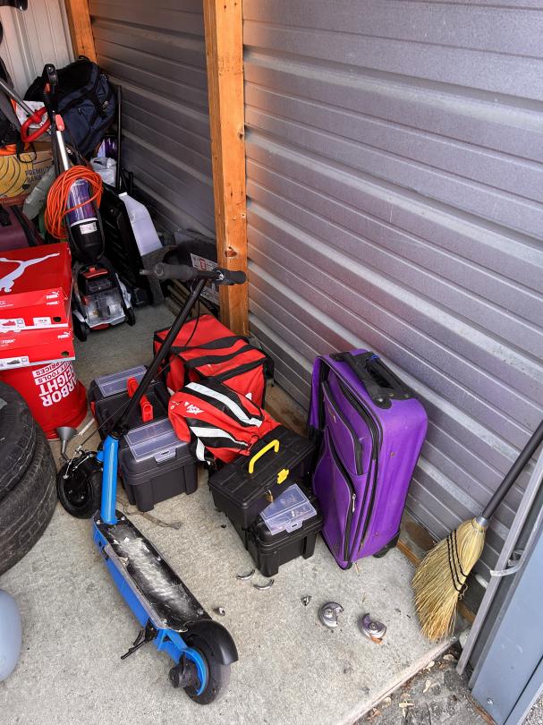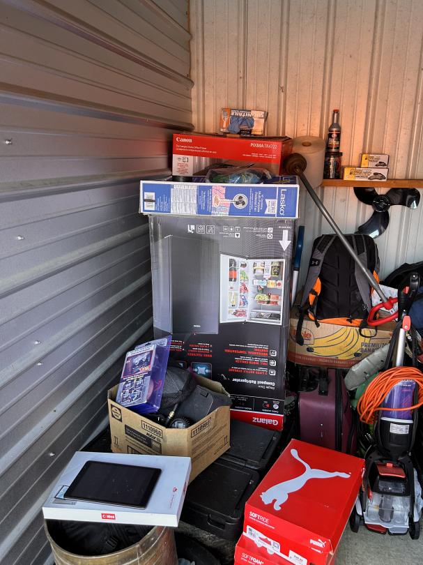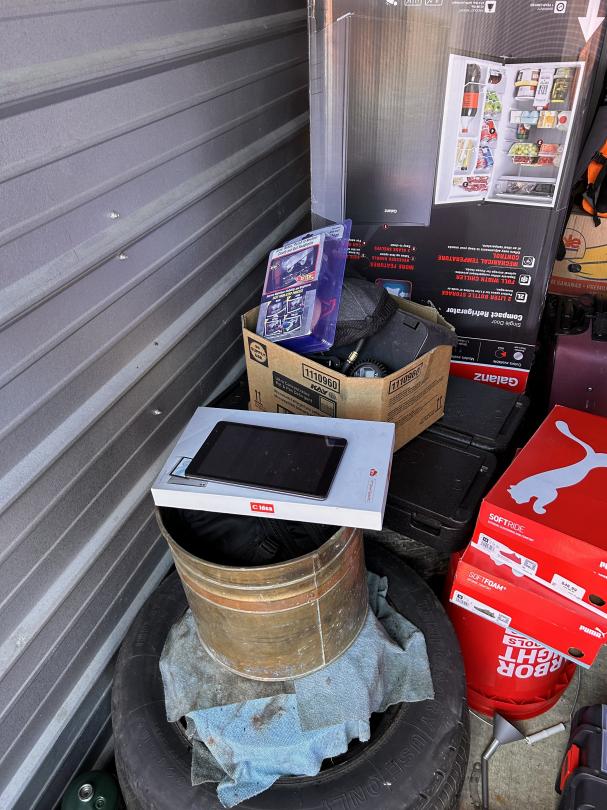 This unit appears to contain…Heater, Air Compressor, Mini Fridge, Tablet, Weed eater, shoes, Luggage, Tires, Broom, Backpacks, Toolbox, Electric Scooter