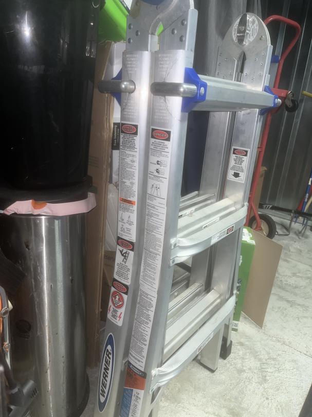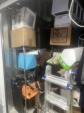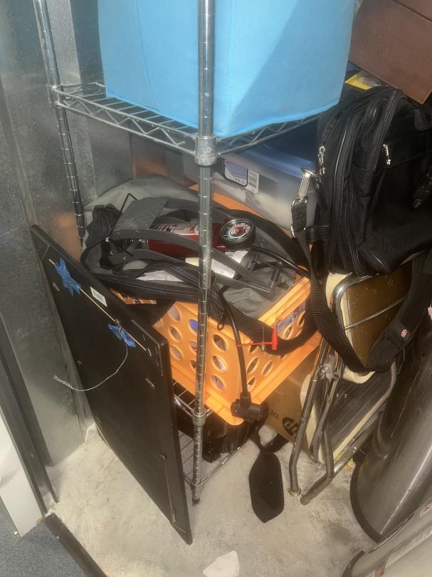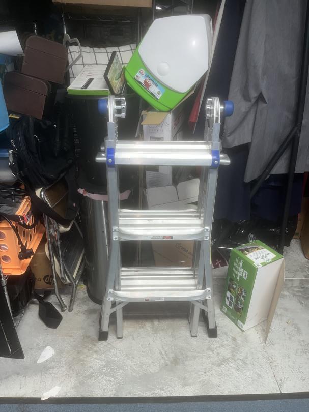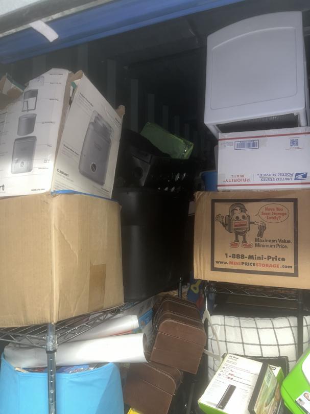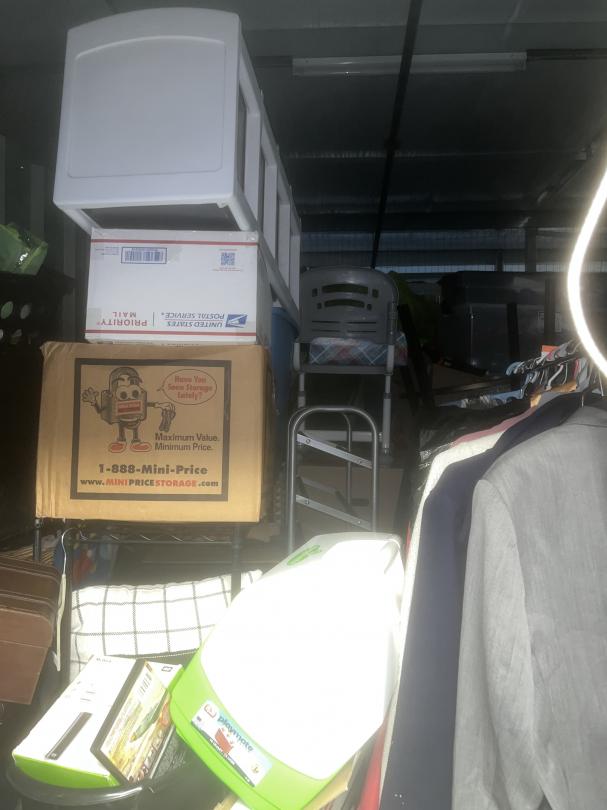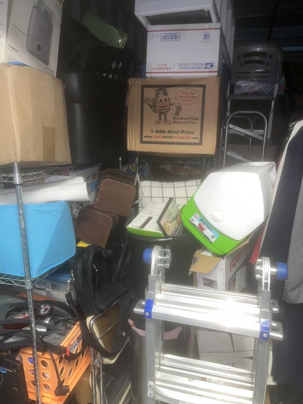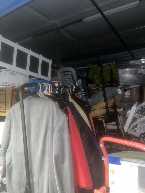 This unit appears to contain…Garment rack, Clothes, Ladder, Boxes, Dolly, Metal shelf, Cooler, Trifold door, Chairs, Bats, Lamp, Various household items