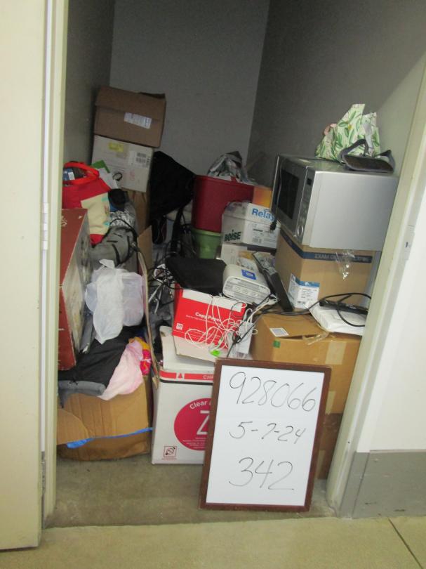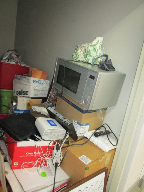 This unit appears to contain…5 totes, microwave, 13 boxes, cable box, wifi router, blue ray dvd player, home decor, sweeper, backpack