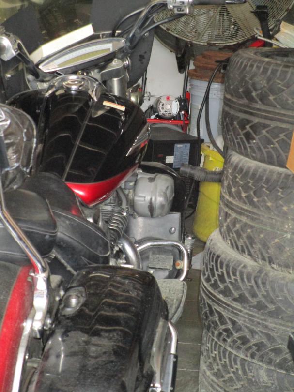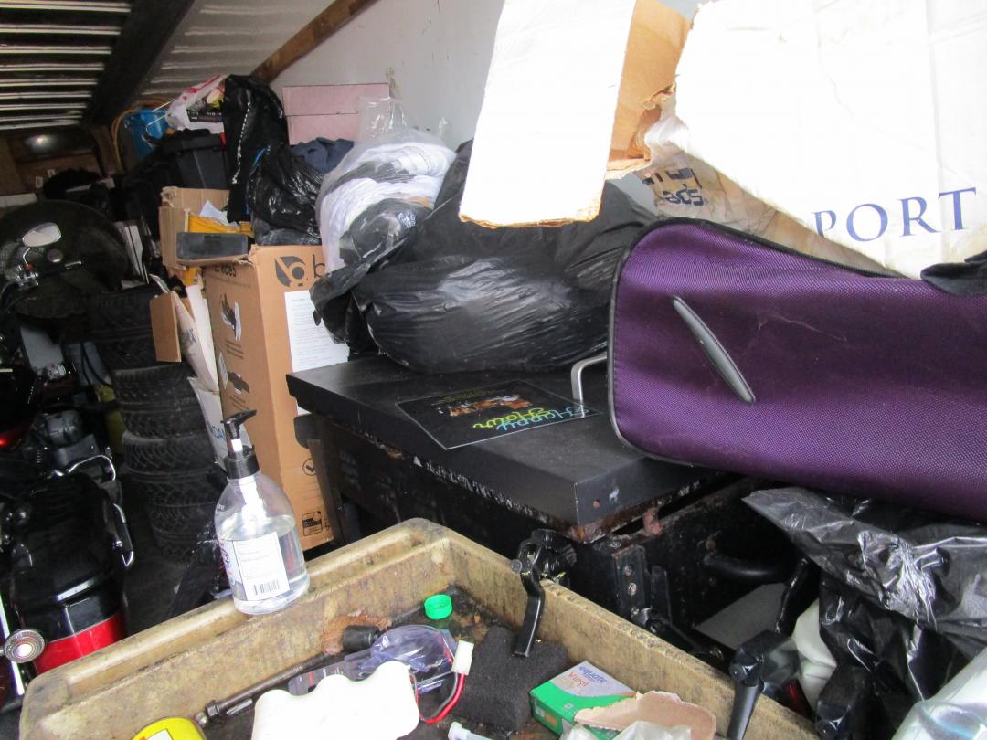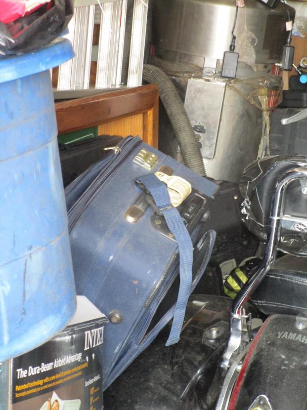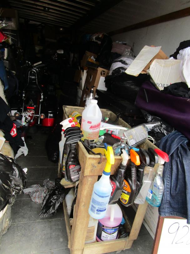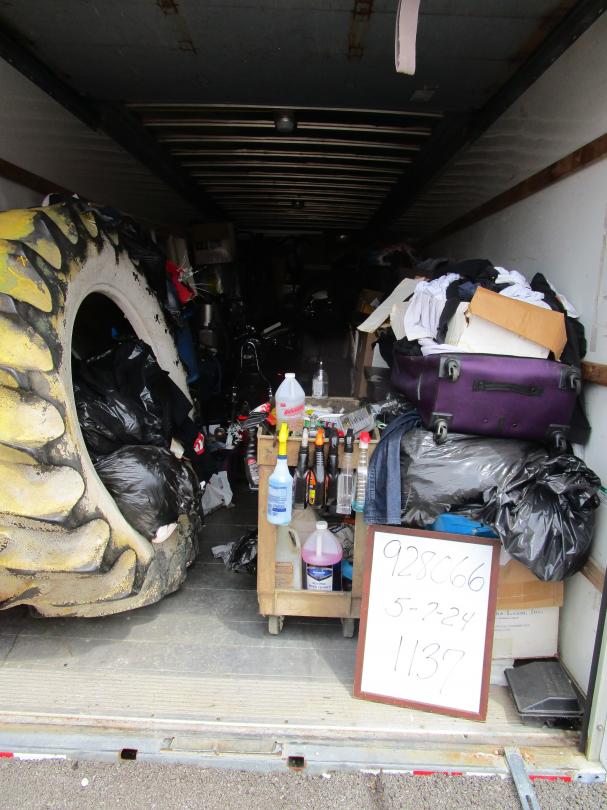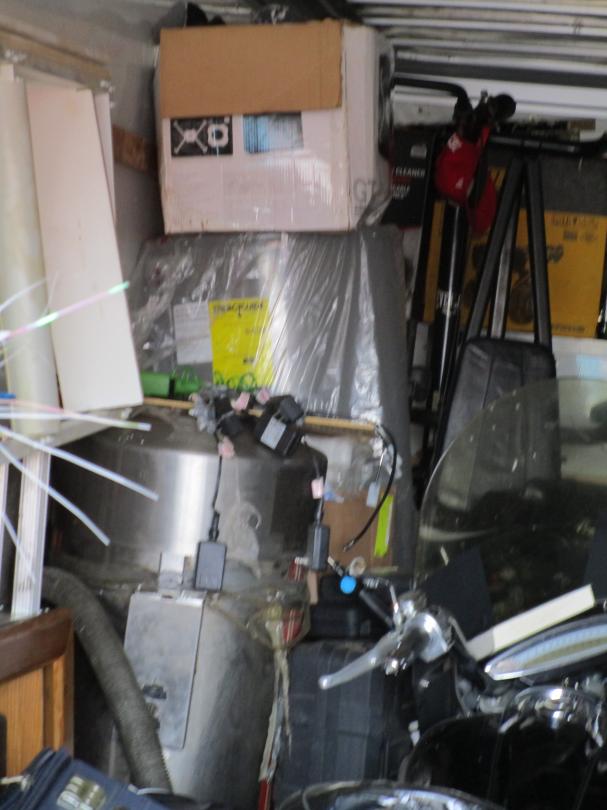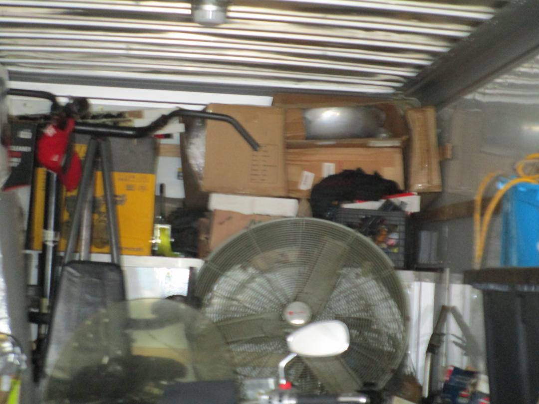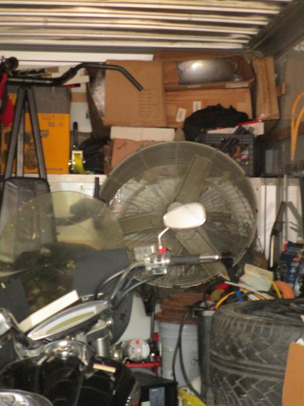 This unit appears to contain…Motorcycle, tractor tire, shop cart, 2 suitcases, 4 tires, hand tools, shop fan, grill, car/motorcycle parts, ladder, compressor, bags and boxes, exercise equipment, water heater, drain snake