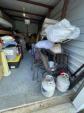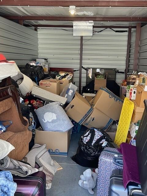 This unit appears to contain…couch and love seat, patio chairs, luggage, totes, boxes, glass table, nightstand, bicycle, dining chairs, 2 end tables, mattress, desktop computer, decor, kitchenware