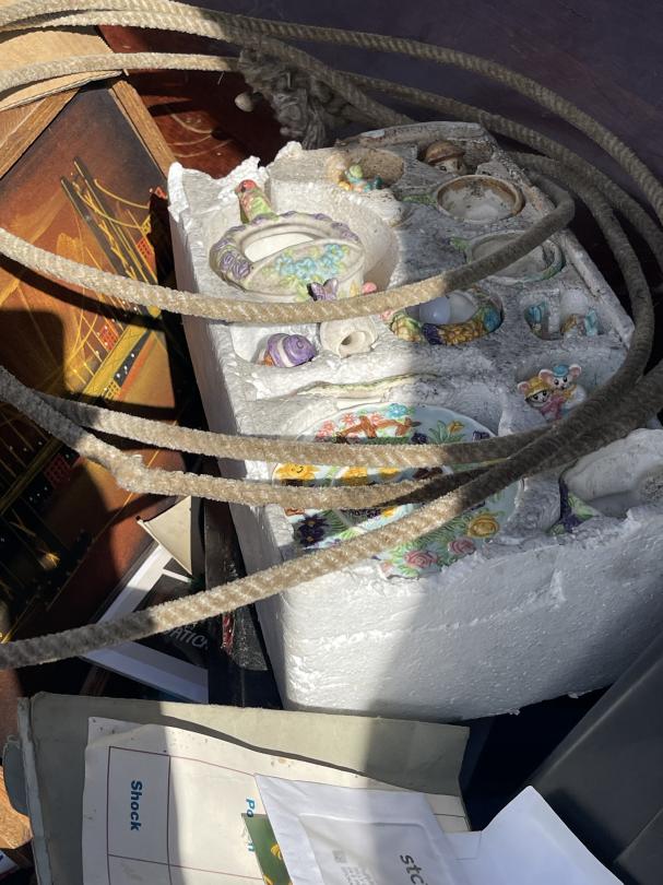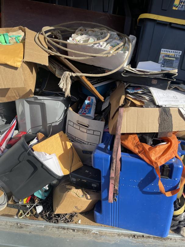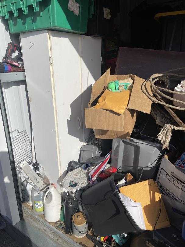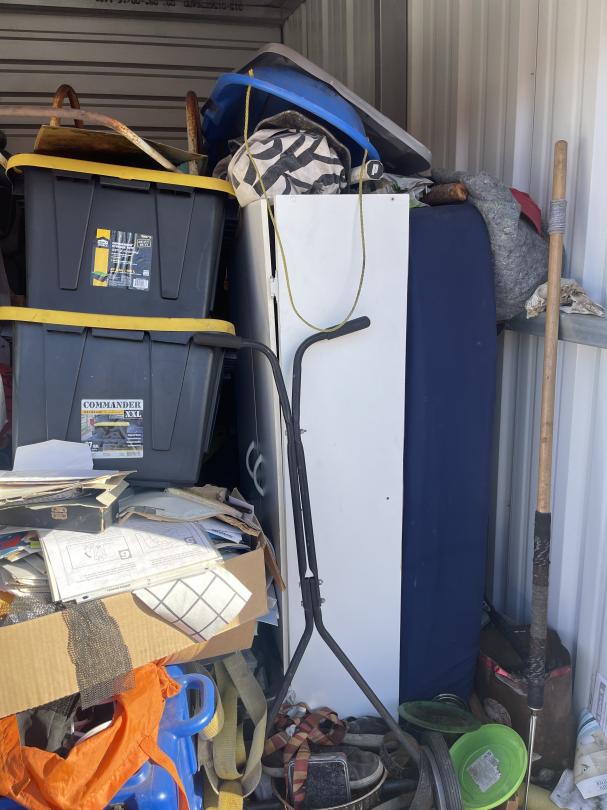 This unit appears to contain…Reel Mower, Spear, Speaker, Hitch balls, Squash rackets, Mattress, Cabinets, Totes, Tea set, Wall art, Lasso, Tie down straps, Shoes, Jumper cables, Water bottles, HP Photo smart, Pool cue, Luggage, Furniture, Wheel barrow, Pillow, Paint, Clothes, Chain, Boxes, Possible cash box, Leather tooled belt, etc...