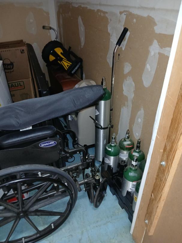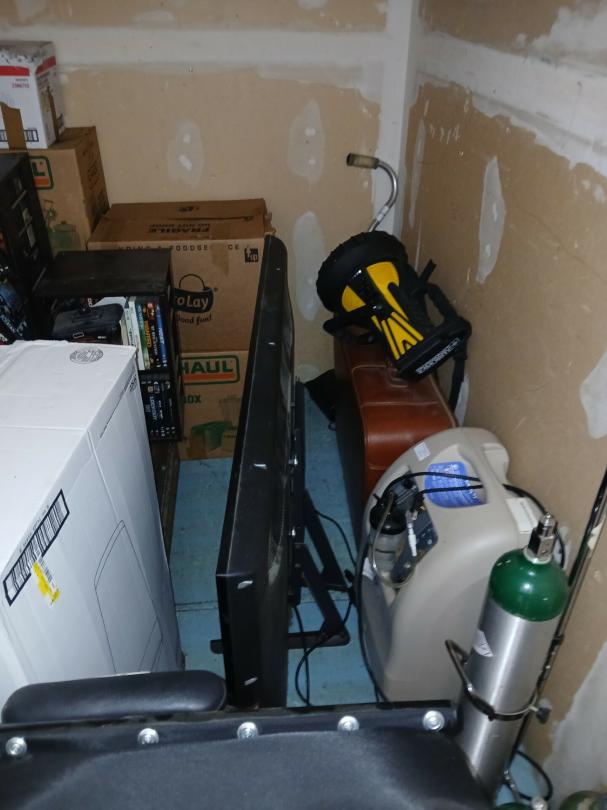 This unit appears to contain…Oxygen Tanks Wheelchair Portable Concentrator Cane Suitcase Television 3 + Boxes DVD's w/ 3 Milk Crates