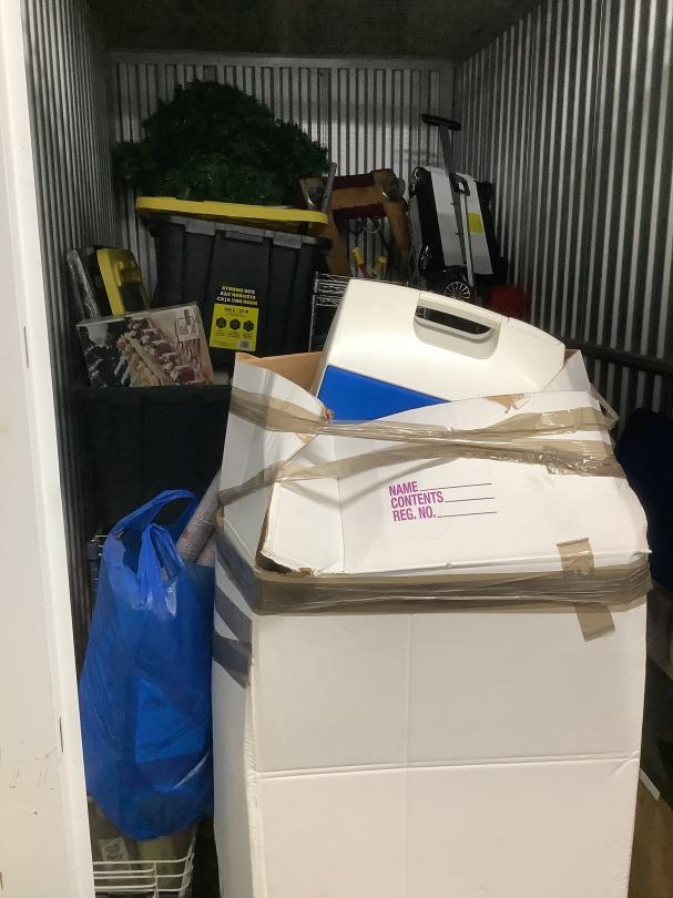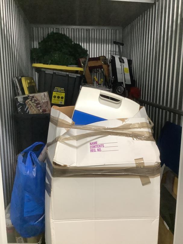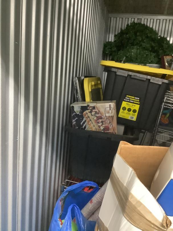 This unit appears to contain…Unit appears to contain Christmas decorations, bins, boxes, toys, dollies seal 1837841