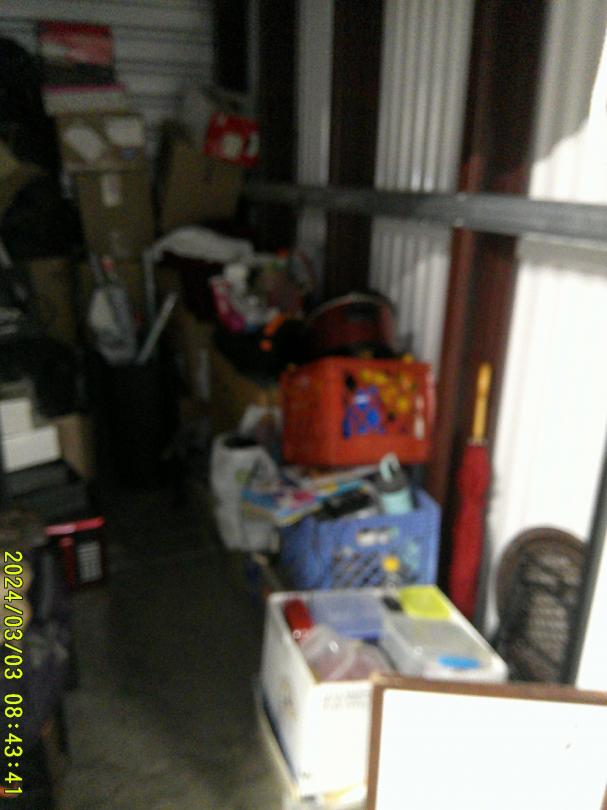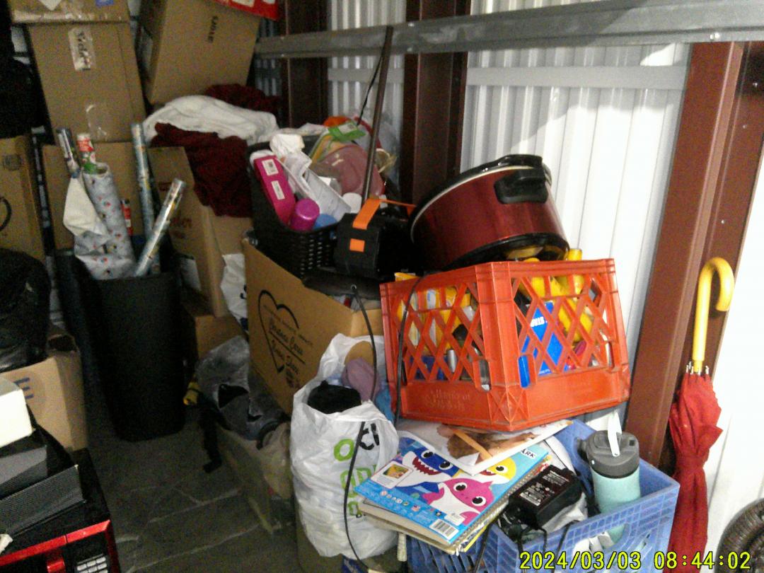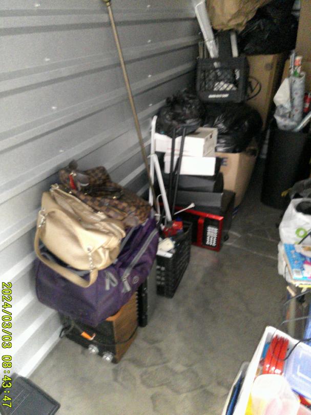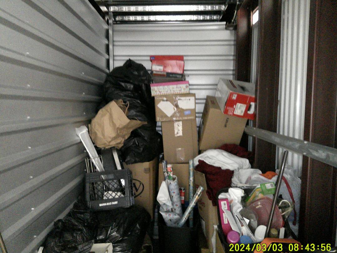 This unit appears to contain…heater, crockpot, microwave, shoes, wrapping paper, curtain rods, 6 boxes, 4 bags, umbrella, clothes, purses, duffel bag