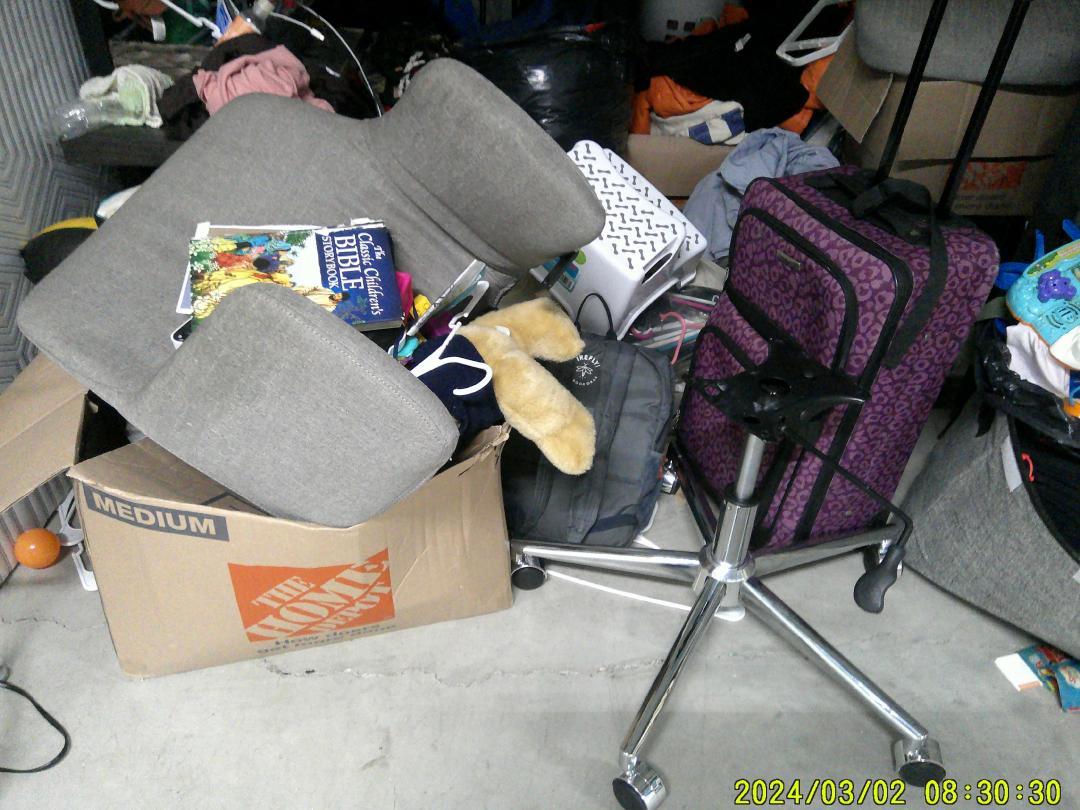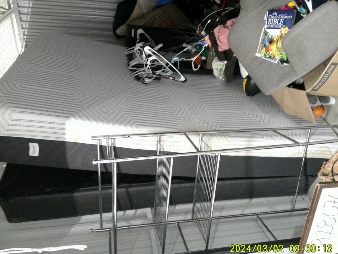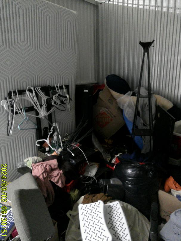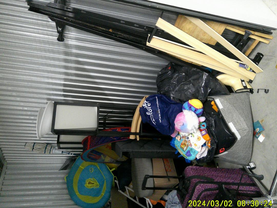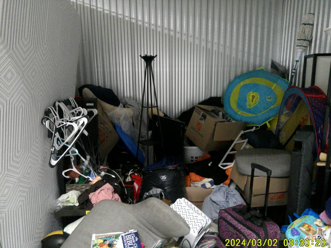 This unit appears to contain…3 floor lamps, mattress, box spring, flat screen, shelves, 4+ boxes, luggage, cooler, clothes, shoes, 3 bags, mop, bed frame