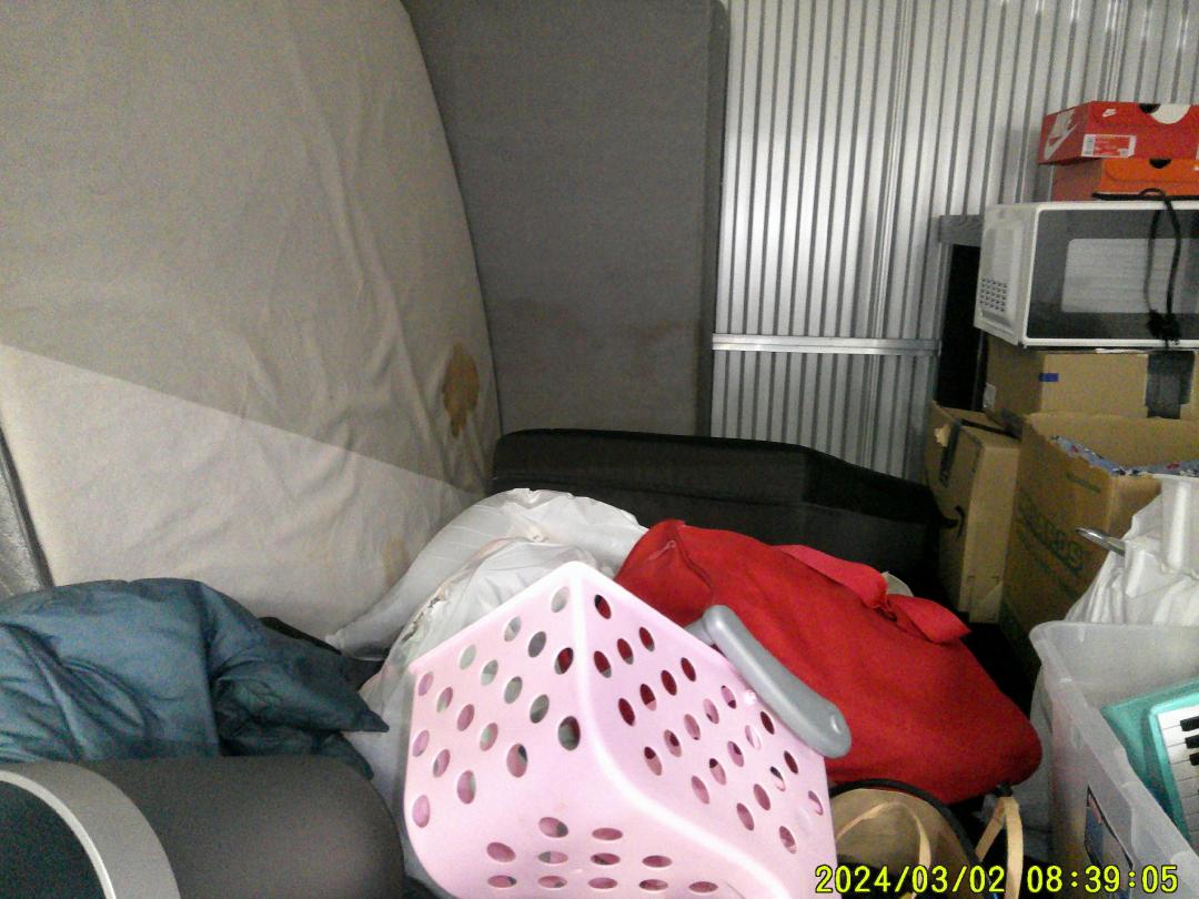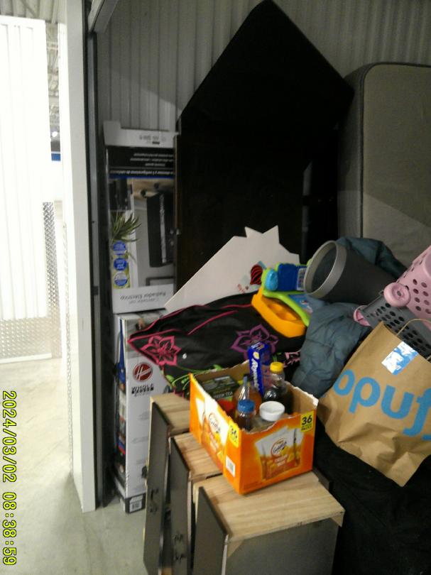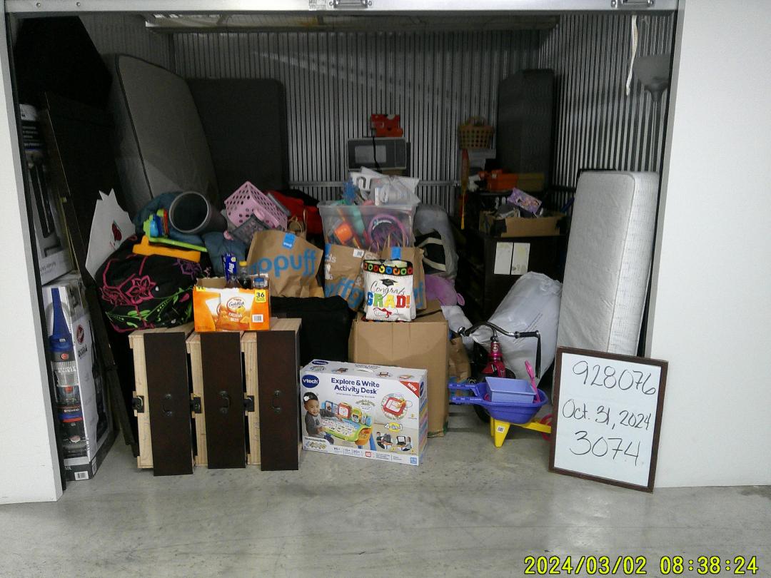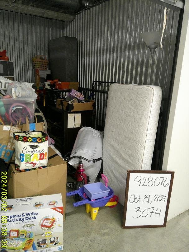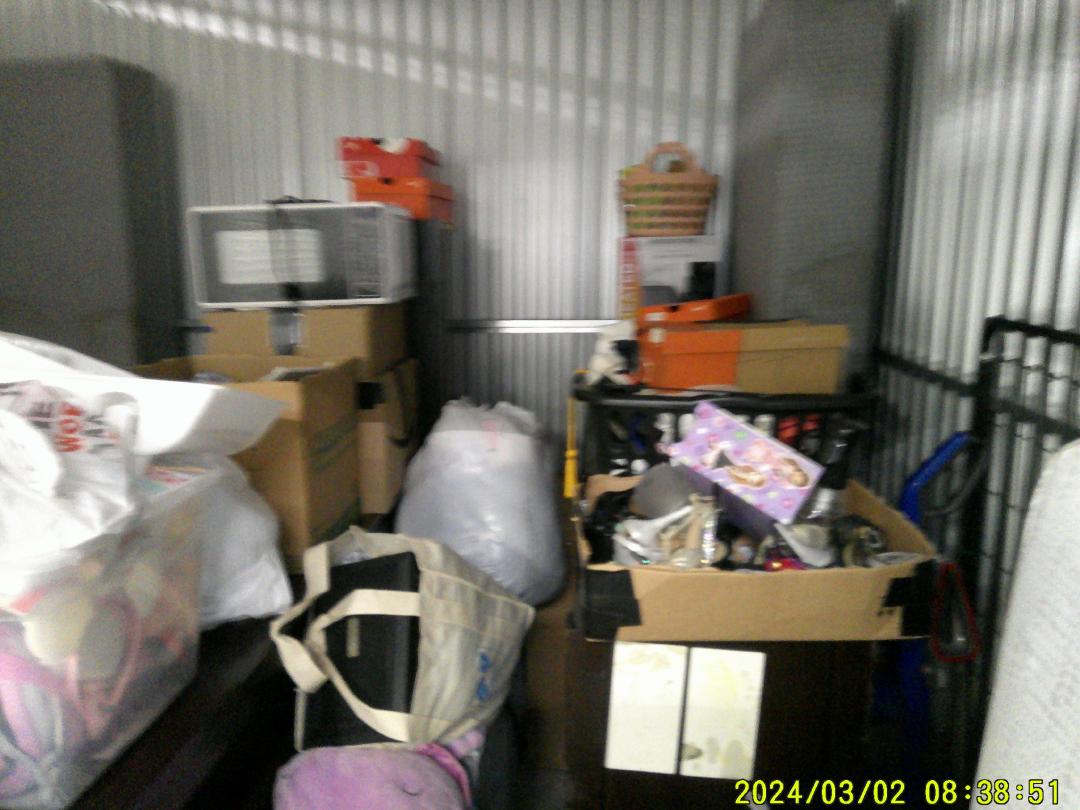 This unit appears to contain…twin mattress/ box spring, vacuum, toddler mattress, microwave, bed frame, dresser, shoes, 4+ bags, tricycle, kid toys, 5 boxes