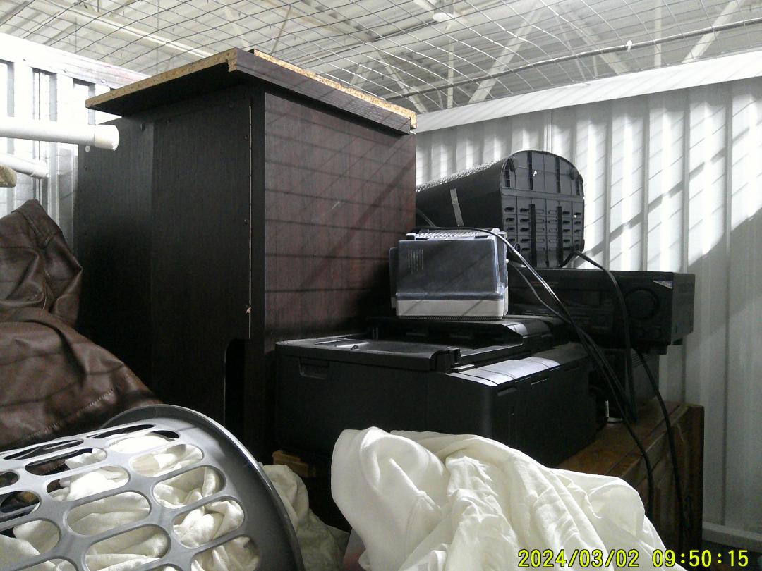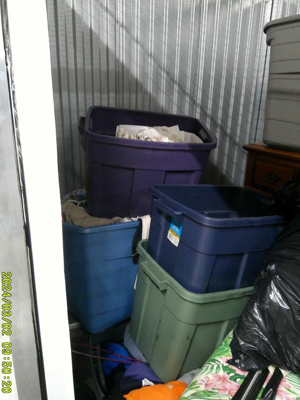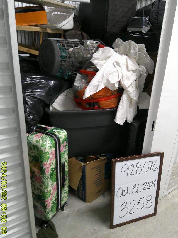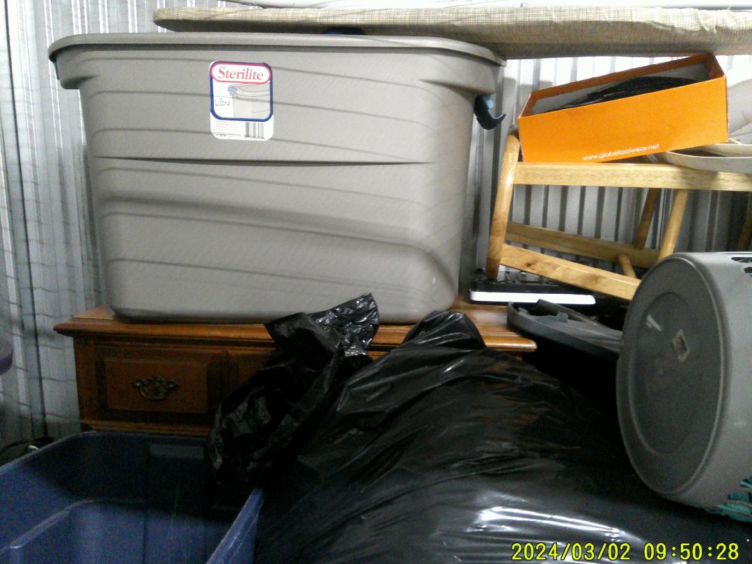 This unit appears to contain…6+ totes, luggage, ironing board, 3 dressers, flat screen, stool, heater, printer, electronics, 2+ bags, clothes