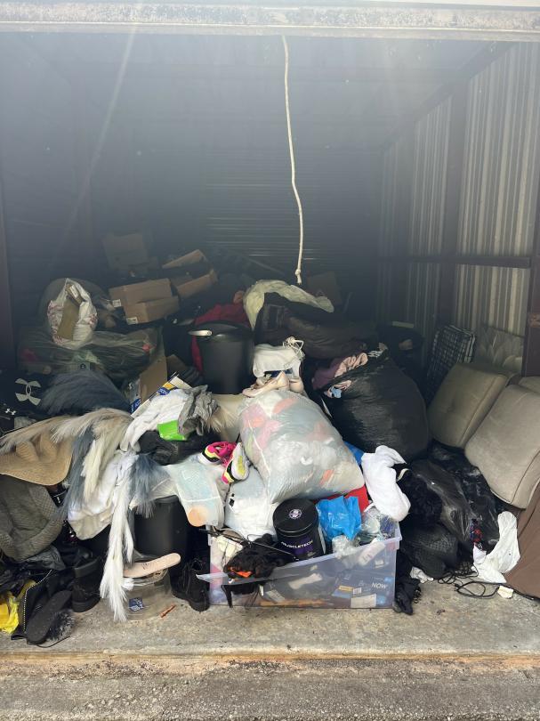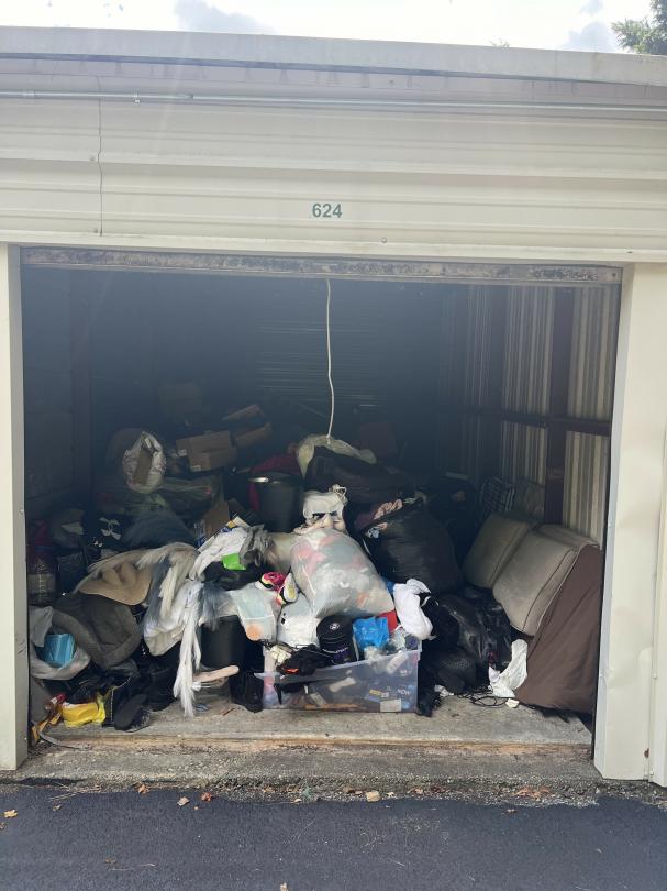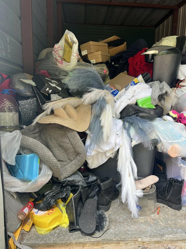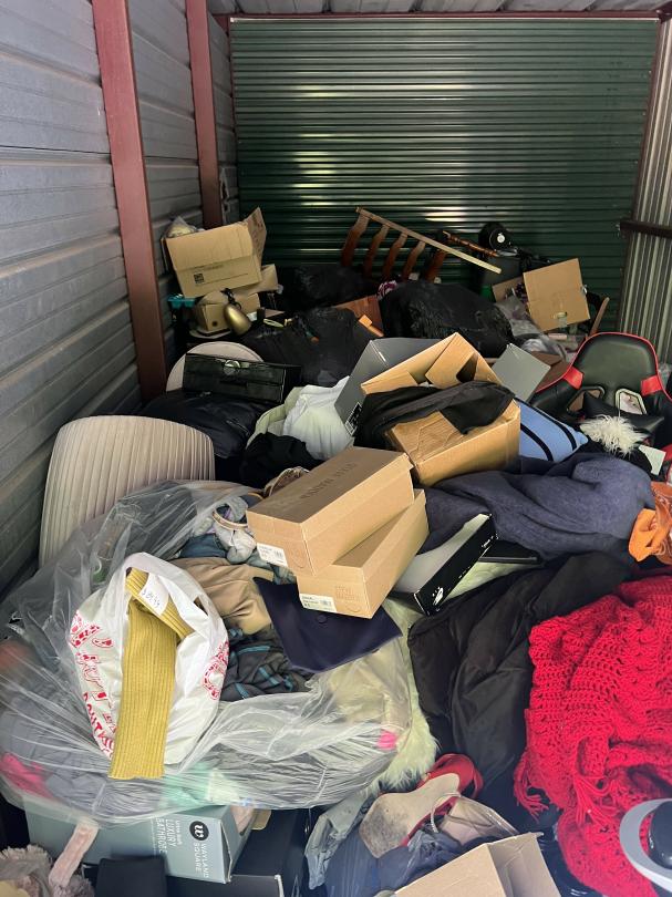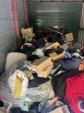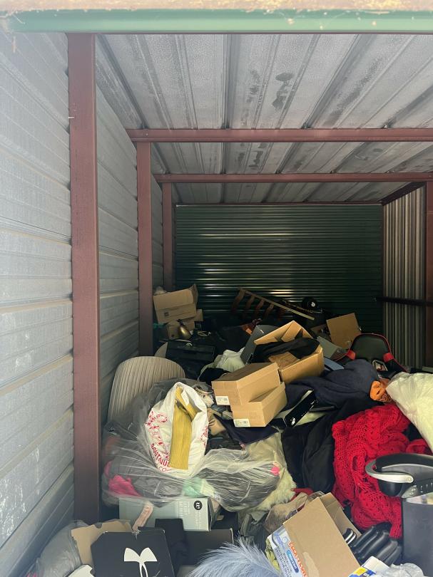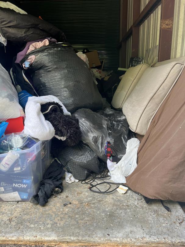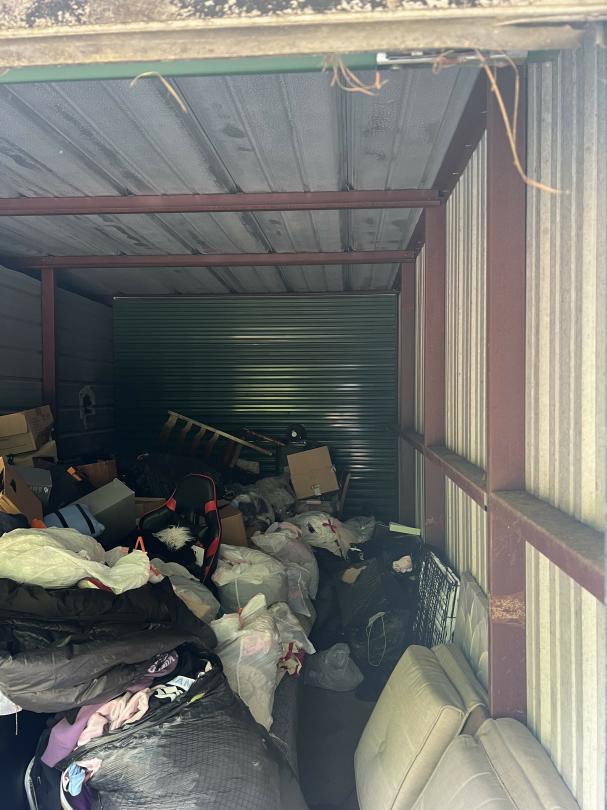This unit appears to contain…Dog bed, clothes, bags, coffee maker, computer chair, dinning room chairs, totes, cushions, unknown items