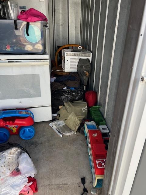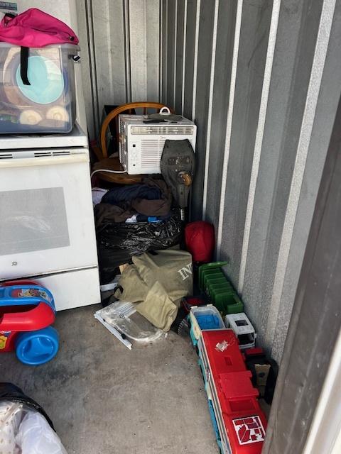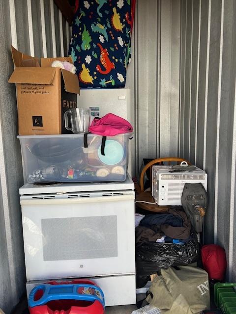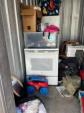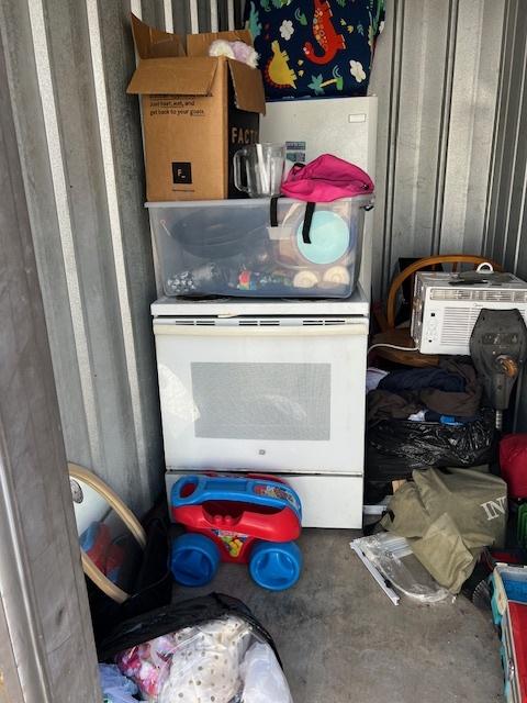This unit appears to contain…Stove , refrigerator Rocking chair ,boxes Bags . table , kitchenware