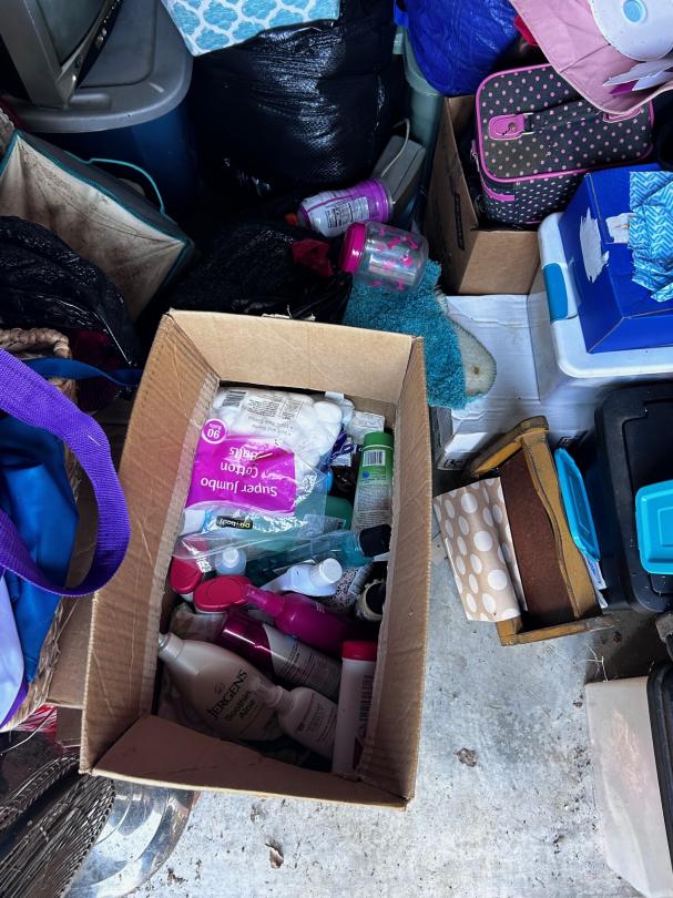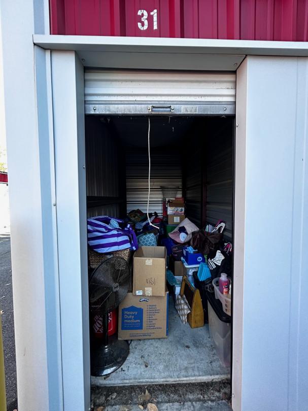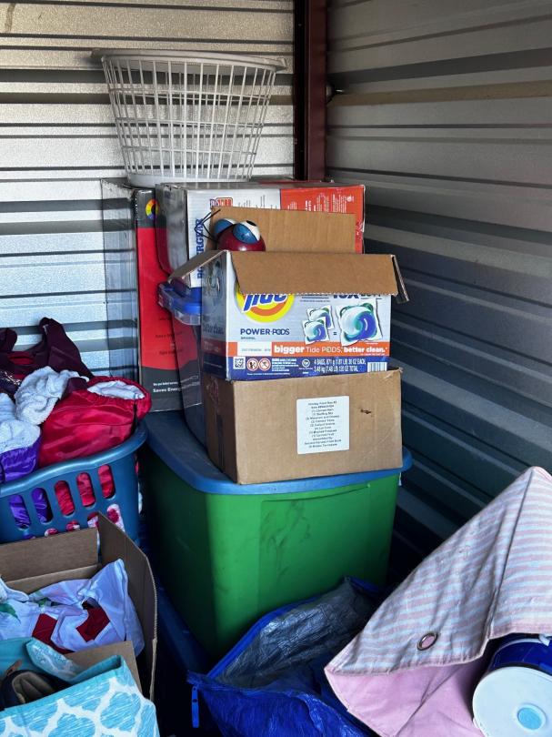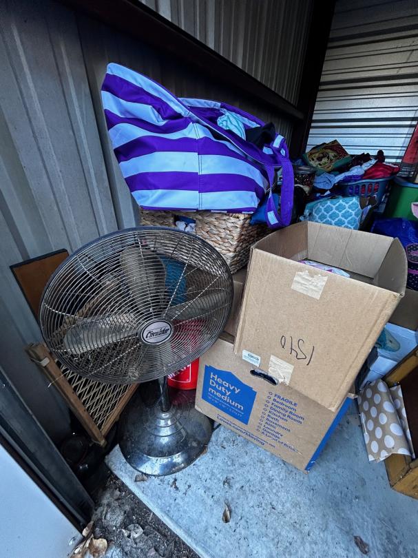 This unit appears to contain…Fan, clothes, home decor, boxes, bags, totes, 12" box tv, shoes, pet gate, hygiene products