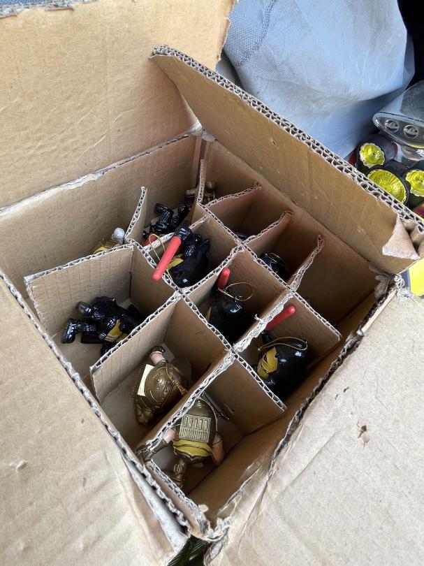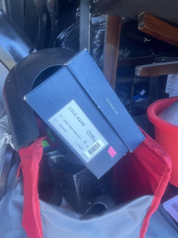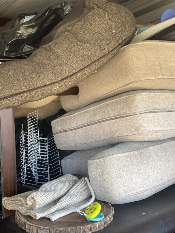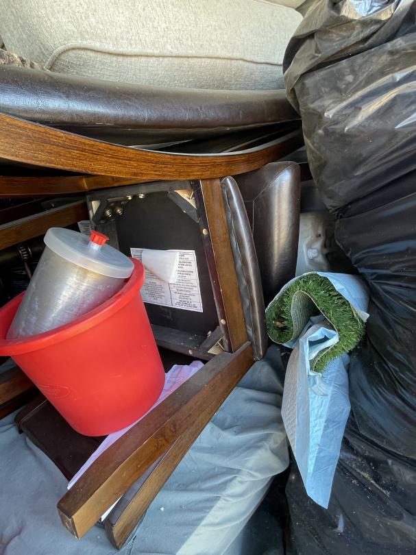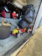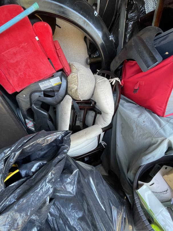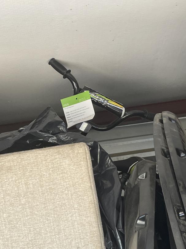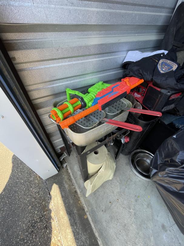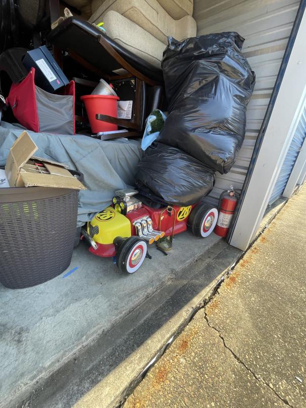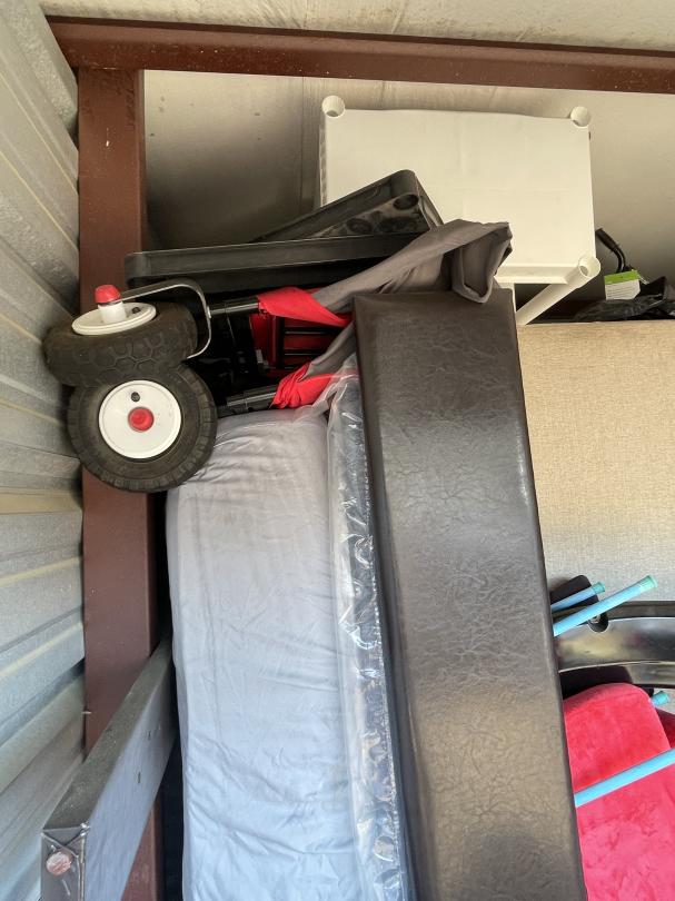 This unit appears to contain…Kids ride-on race car, collapsable wagon, beige couch, headboard and footboard for leather platform bed, fry baskets/burner, rocking chair and ottoman, leaf bag for lawn mower, Milwaukee radio/speaker, children's bike with tags attached, kitchen table and chairs, ice cream maker, tool set, toys, kitchen items (pots/pans), Cole Haan men's size 11 shoes, car seat base, Star Wars ornament set, truck accesories.