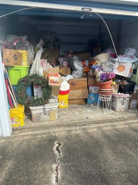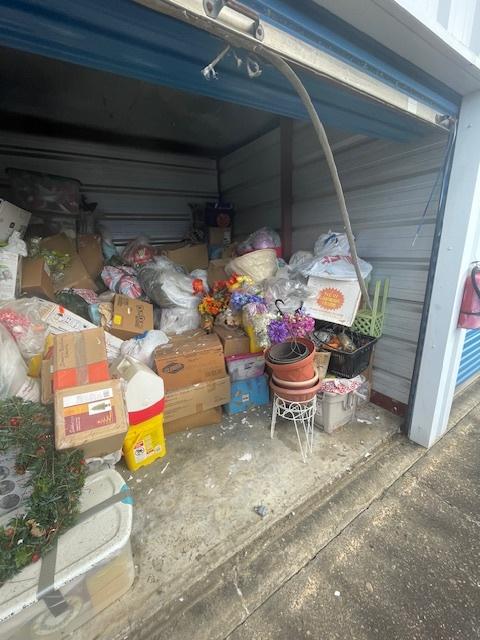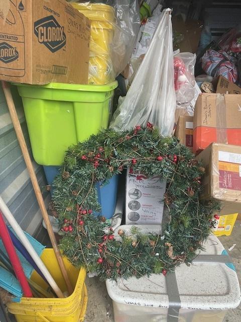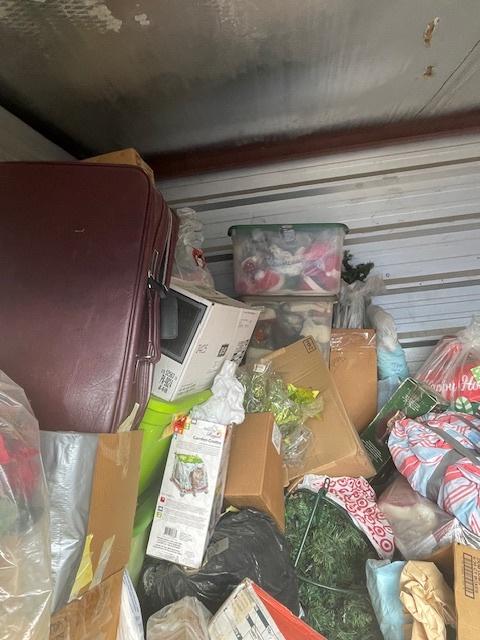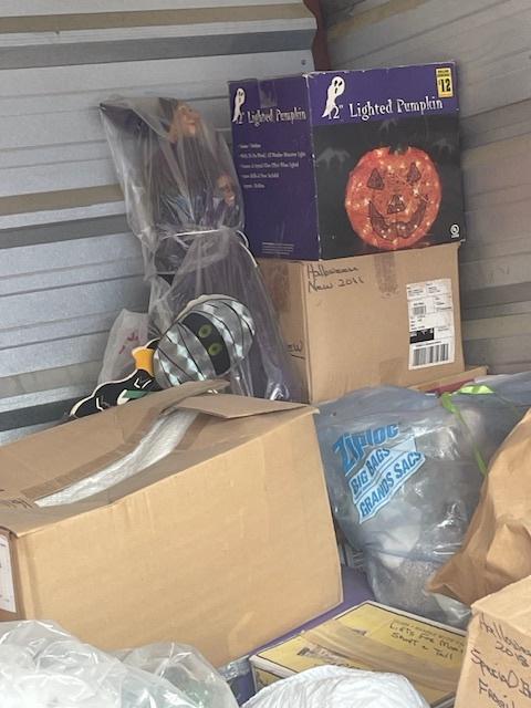 This unit appears to contain…Large variety of Christmas, Halloween/Fall and Easter decor, Christmas trees, box of gift bags, ribbons, bows and gift wrapping supplies, Dirt Devil vacuum cleaner, yard tools, bowling shoes, soaker hoses and reel, suitcases, flower pots, stuffed animals, fiberoptic Christmas tree in box, Santa and witch figurines and misc boxes and totes.