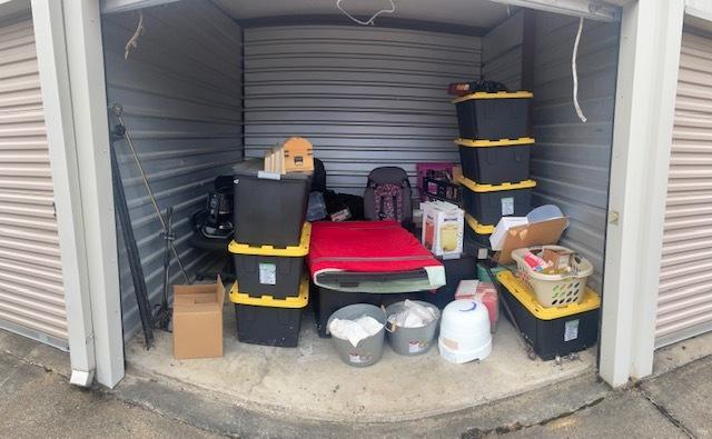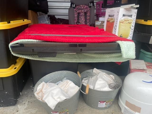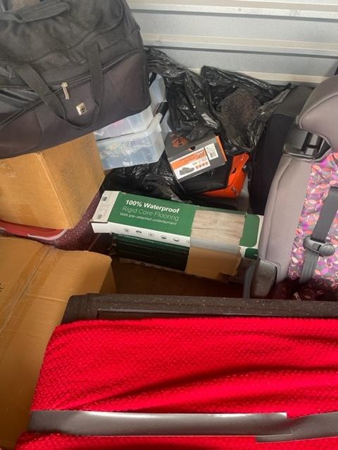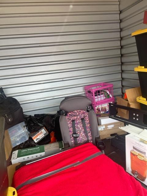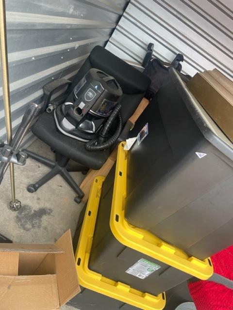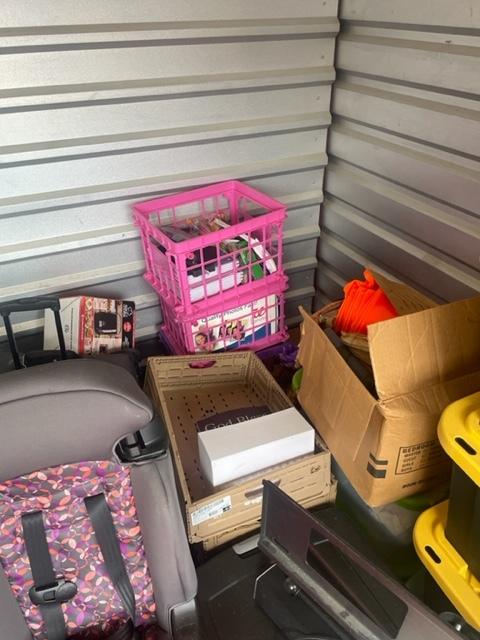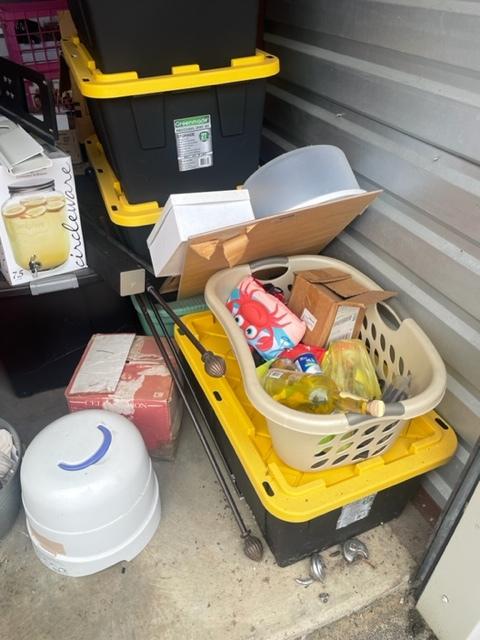 This unit appears to contain…not climate controlled, totes, tv, clothes basket, tubs, car seat, curtain rods, vacuum, boxes
